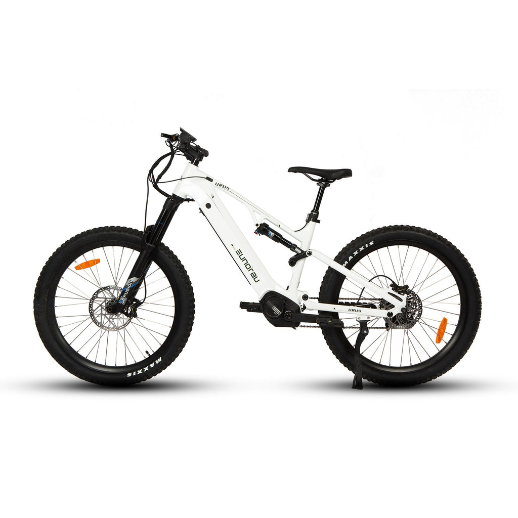 Conquer trails with the URUS 27.5" Mountain E-Bike, engineered for adventure and performance. Equipped with a 48V 500W BAFANG M600 mid motor and a 17.5Ah SAMSUNG battery, this e-bike delivers a 40–65 mile range and speeds up to 28 MPH. The front and rear suspension system, paired with MAXXIS Minion tires, ensures smooth rides over rough terrains.
