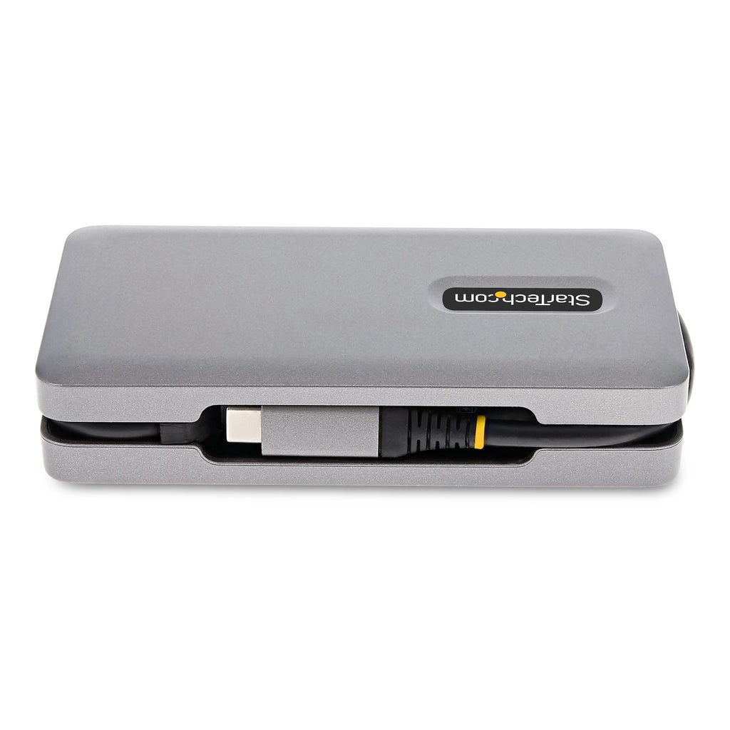 The USB-C Multiport Adapter Travel Mini Dock combines high-definition video, fast data transfer, and power delivery in a compact, portable design. Supporting 4K video output at 60Hz via HDMI or DisplayPort, this dock delivers crisp visuals for presentations and entertainment. The 3-port USB 3.0 hub allows multiple peripherals, while Gigabit Ethernet provides stable wired internet connectivity. With 100W USB-C Power Delivery passthrough, keep your laptop fully charged during use. The 1ft (30cm) wrap-around cable offers flexible cable management and easy portability—ideal for remote work and travel.