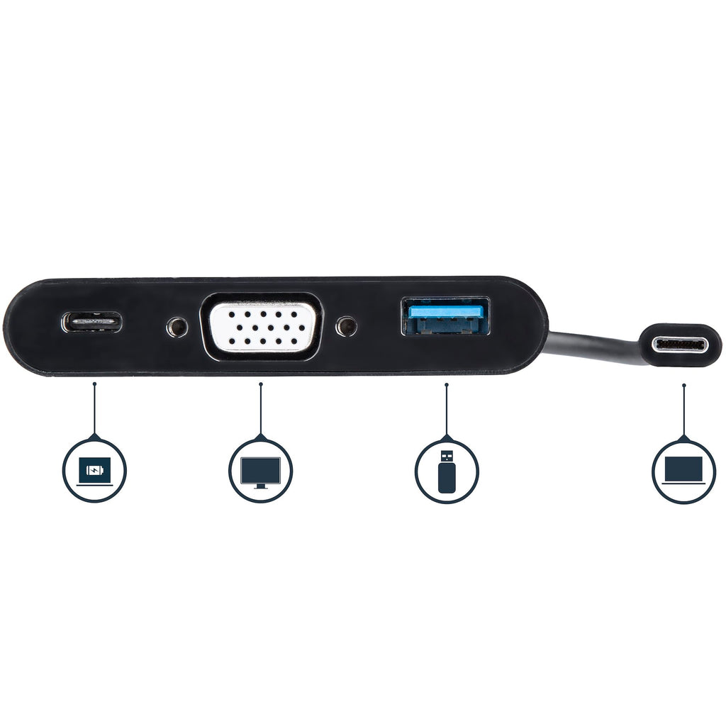 This USB-C VGA Multiport Adapter is a versatile solution for connecting modern USB-C laptops to legacy VGA displays while maintaining productivity with USB 3.0 and Power Delivery support. It offers a VGA port for video output up to 1080p, a USB-A 3.0 port for high-speed peripherals, and a USB-C PD port to keep your laptop charged with up to 60W passthrough. Compact and travel-friendly, it's perfect for business presentations, classrooms, and mobile workstations.