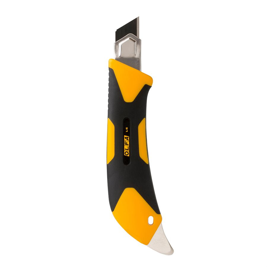 The Utility Knife L-5 is designed for comfort, precision, and durability, making it ideal for construction, warehouse, and DIY applications. Its wraparound rubber grip ensures a secure hold for all-day use, while the fibreglass handle provides strength and lightweight performance. Preloaded with a black ultra-sharp 18mm snap-off blade, the knife is perfect for cutting drywall, linoleum, carpet, flooring materials, insulation, and cardboard in packing or warehouse work. The ratchet-lock mechanism ensures safe, adjustable blade extension for consistent cutting performance.