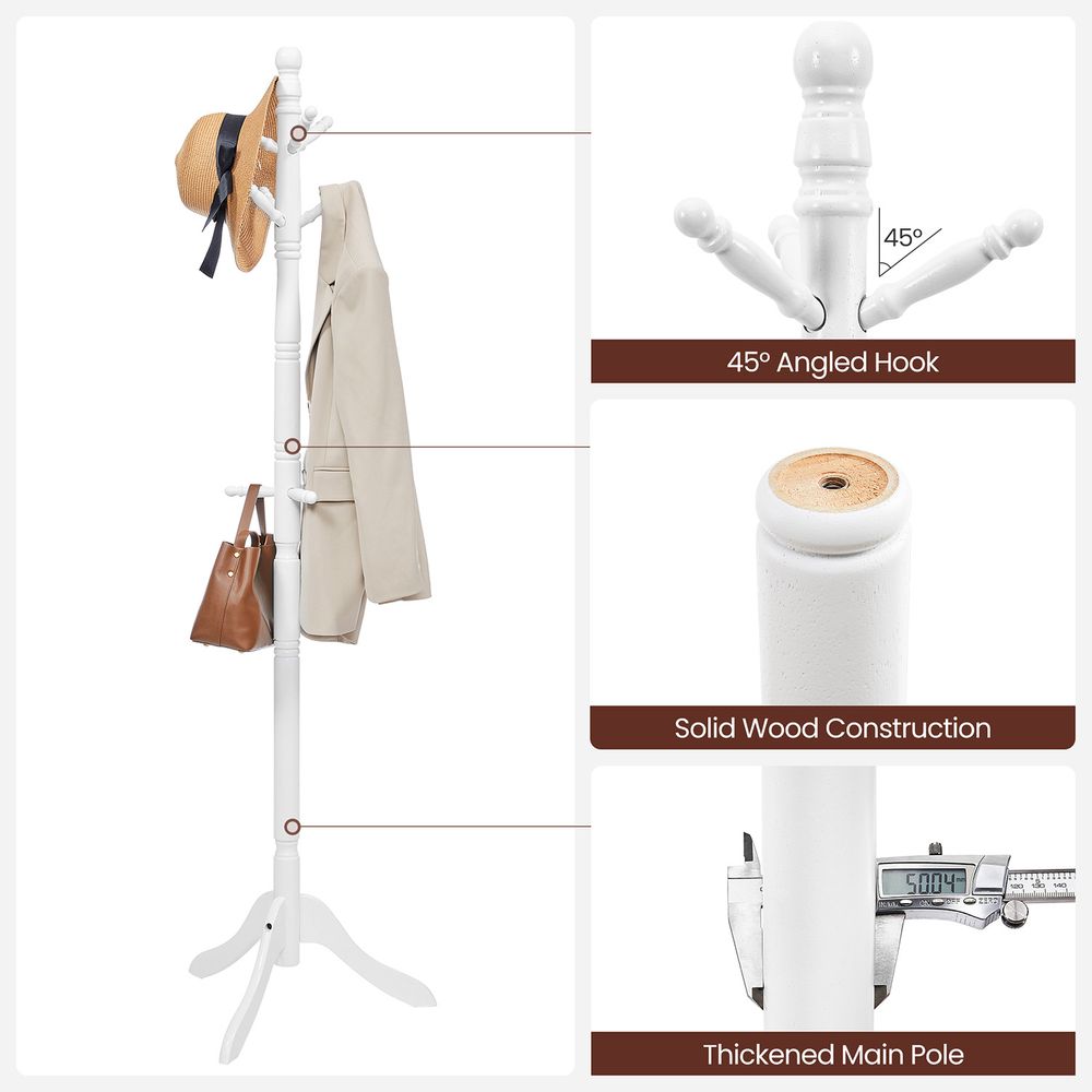 The VASAGLE Solid Wood Coat Rack and Stand with 10 Hooks blends timeless elegance with reliable strength, making it a perfect addition to any entryway, hallway, or bedroom. Crafted from solid rubberwood, this coat stand features a 2-inch thick central pole and a sturdy tri-legged base for exceptional stability. With nine rounded hooks and a top knob for hats, it provides ample space to neatly organize coats, bags, scarves, and accessories. The smooth, turned-wood design and natural texture give it a classic look that complements both traditional and modern interiors. Easy to assemble in minutes, this durable coat rack offers both beauty and practicality for everyday use.