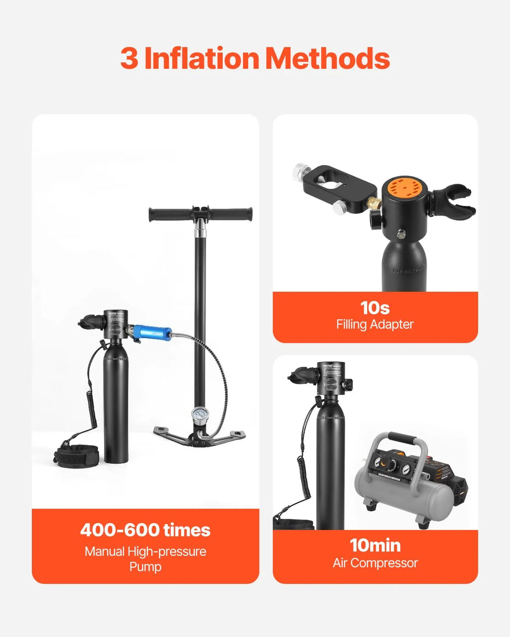 Experience deeper underwater adventures with the VEVOR 0.5L Scuba Lung Tank Kit, perfect for beginner divers. This refillable air tank allows dives up to 98.43 ft (30 m) and provides 5–10 minutes of usage per cylinder. Made from durable Aluminum 6061, the kit includes a snorkel mask and security leash for safe, convenient, and comfortable underwater exploration. Clear vision and effortless operation make it ideal for recreational diving and snorkeling.