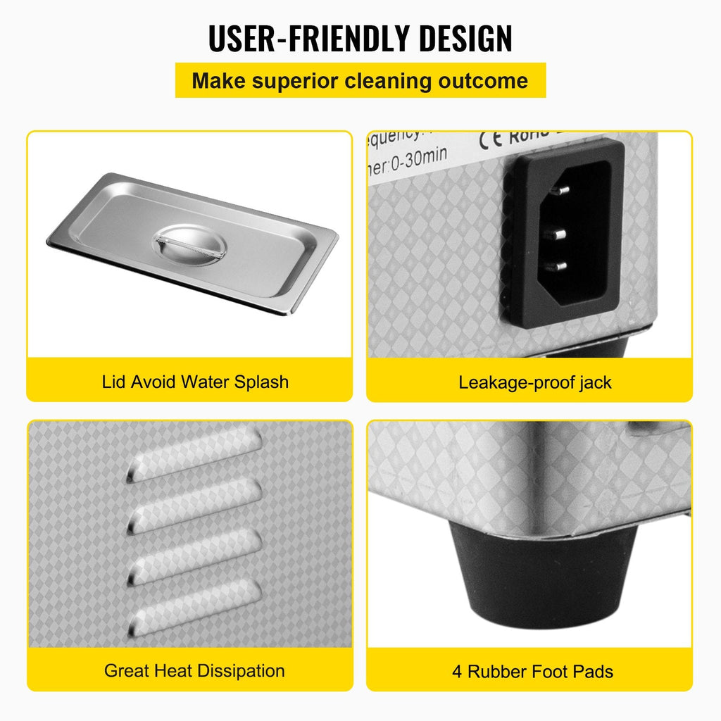 The VEVOR 0.8L Professional Ultrasonic Cleaner offers a powerful and efficient cleaning solution for various small items. With a 0.8-liter capacity and made from high-quality 304 stainless steel, this ultrasonic cleaner is designed to handle delicate and intricate items such as jewelry, watches, glasses, circuit boards, dentures, and dental instruments. The digital control panel features a timer and adjustable settings for precise cleaning, ensuring thorough and gentle removal of dirt, grime, and contaminants. Its compact size makes it ideal for use in labs, workshops, and home settings.
