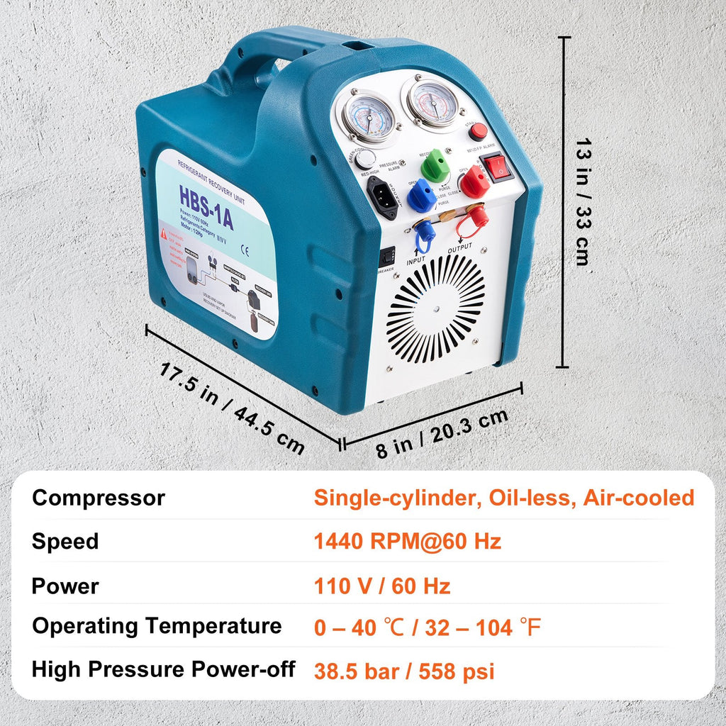 The VEVOR 1/2HP Refrigerant Recovery Machine is a portable and efficient solution designed for automotive HVAC and air conditioning repair. Operating on 115V AC, this refrigerant recycling unit features an oil-less compressor and self-purge function, ensuring clean, hassle-free operation. Equipped with a precise pressure gauge, oversized condenser and fan, it delivers reliable performance even under heavy use. Compact yet powerful, the machine is suitable for a wide range of refrigerant gases and applications, making it an essential tool for technicians working in various environments.