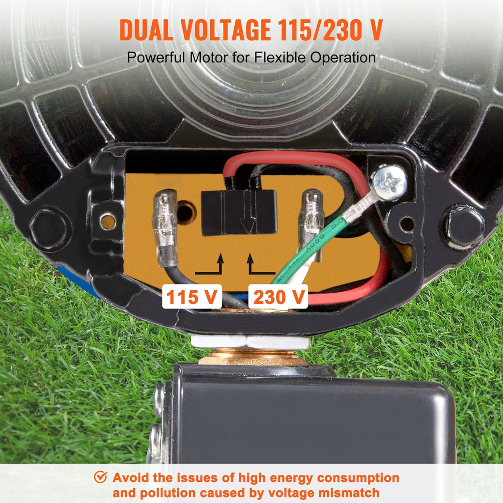 The VEVOR 1.5 HP Cast Iron Sprinkler Pump is designed for efficient irrigation and water boosting applications. Built with robust cast iron construction, it delivers a powerful 66 GPM flow at 3450 RPM, ideal for shallow wells, lakes, and lawn sprinkler systems. This pump features automatic start/stop operation and supports dual voltage input (115/230V) for versatile installation. Its whisper-quiet performance and proper priming system ensure reliable, low-maintenance operation. Equipped with a 1" NPT outlet and 1-1/4" NPT inlet, it handles a maximum head of 98 feet, making it perfect for consistent water pressure needs in irrigation setups.