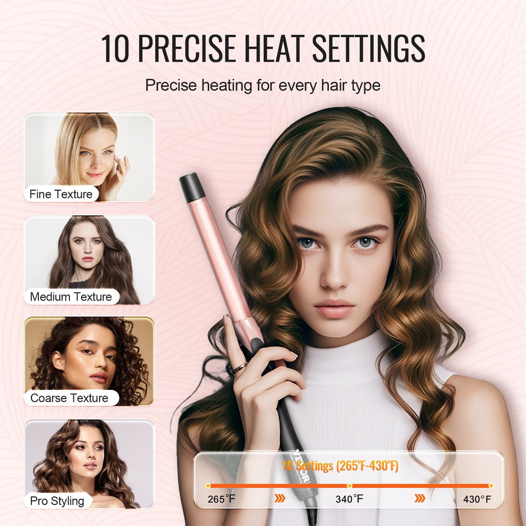 Achieve salon-quality curls at home with the VEVOR 1-Inch Ceramic Curling Wand, designed for all hair types. With 10 adjustable heat settings ranging from 265°F to 430°F, this rose gold styling tool delivers gorgeous, long-lasting curls in minutes. The ceramic barrel emits 5 million high-concentration negative ions to eliminate frizz and add shine, while the smart secure design ensures safe and effortless operation every time.