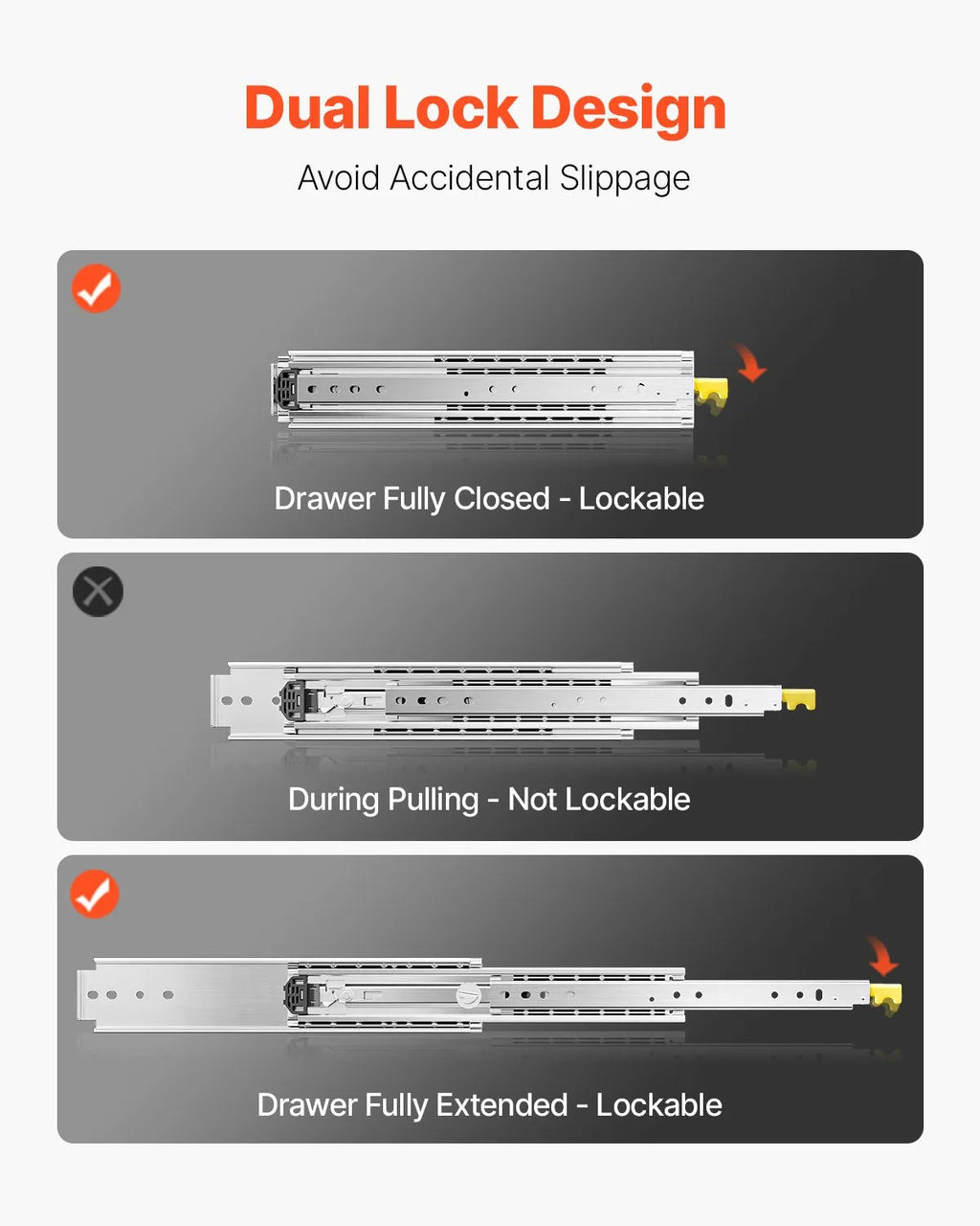 Built for strength, stability, and smooth operation, the VEVOR Heavy-Duty Full Extension Drawer Slides are designed to handle demanding storage needs. With a 500 lb load capacity, secure double-lock system, and full extension design, they are ideal for industrial drawers, cabinets, RVs, trucks, and heavy-duty applications where safety and durability matter.