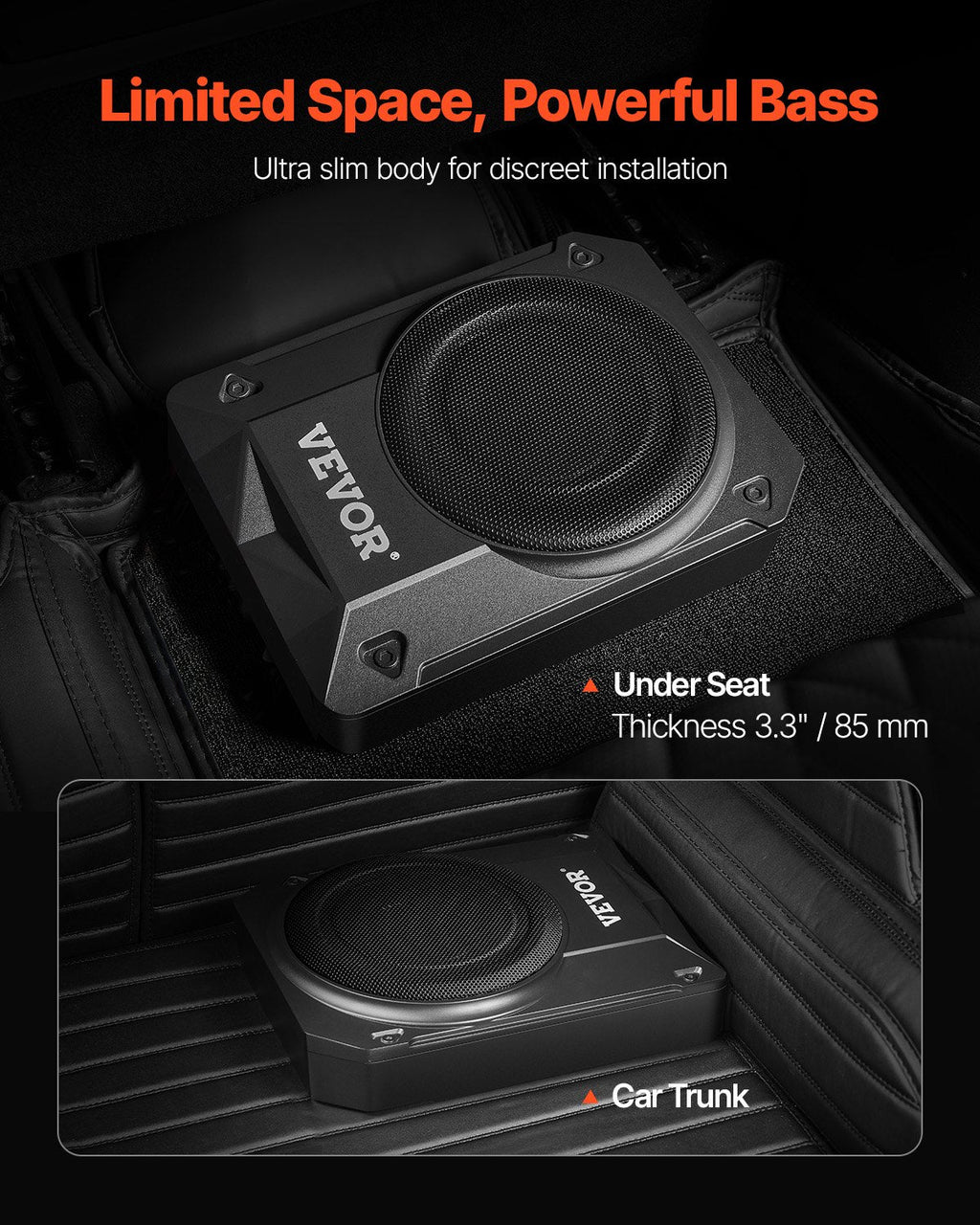 Enhance your in-car audio experience with the VEVOR 10" 400W Under Seat Car Subwoofer. Designed for easy concealed installation, this slim-powered subwoofer delivers deep, powerful bass, transforming your car or truck into an immersive sound system. With a wide frequency range of 50-150 Hz and multiple input options, it ensures seamless integration with your existing audio setup. Featuring auto power on and a wired remote control for easy adjustments, this subwoofer is perfect for drivers who want high-quality sound without sacrificing space.