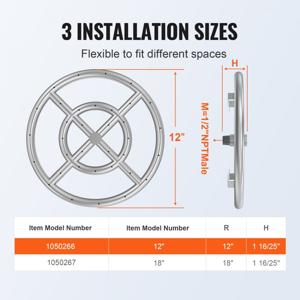Upgrade your fire feature with the VEVOR 12-inch Round Drop-in Fire Pit Pan, built to deliver consistent heat and captivating flames. Designed with durable SUS304 stainless steel and precision-drilled ports, this drop-in burner pan supports both natural gas and propane, making it ideal for indoor or outdoor installations. With an impressive 92,000 BTU output, it's perfect for cozy nights around the fire or creating a show-stopping backyard centerpiece.
