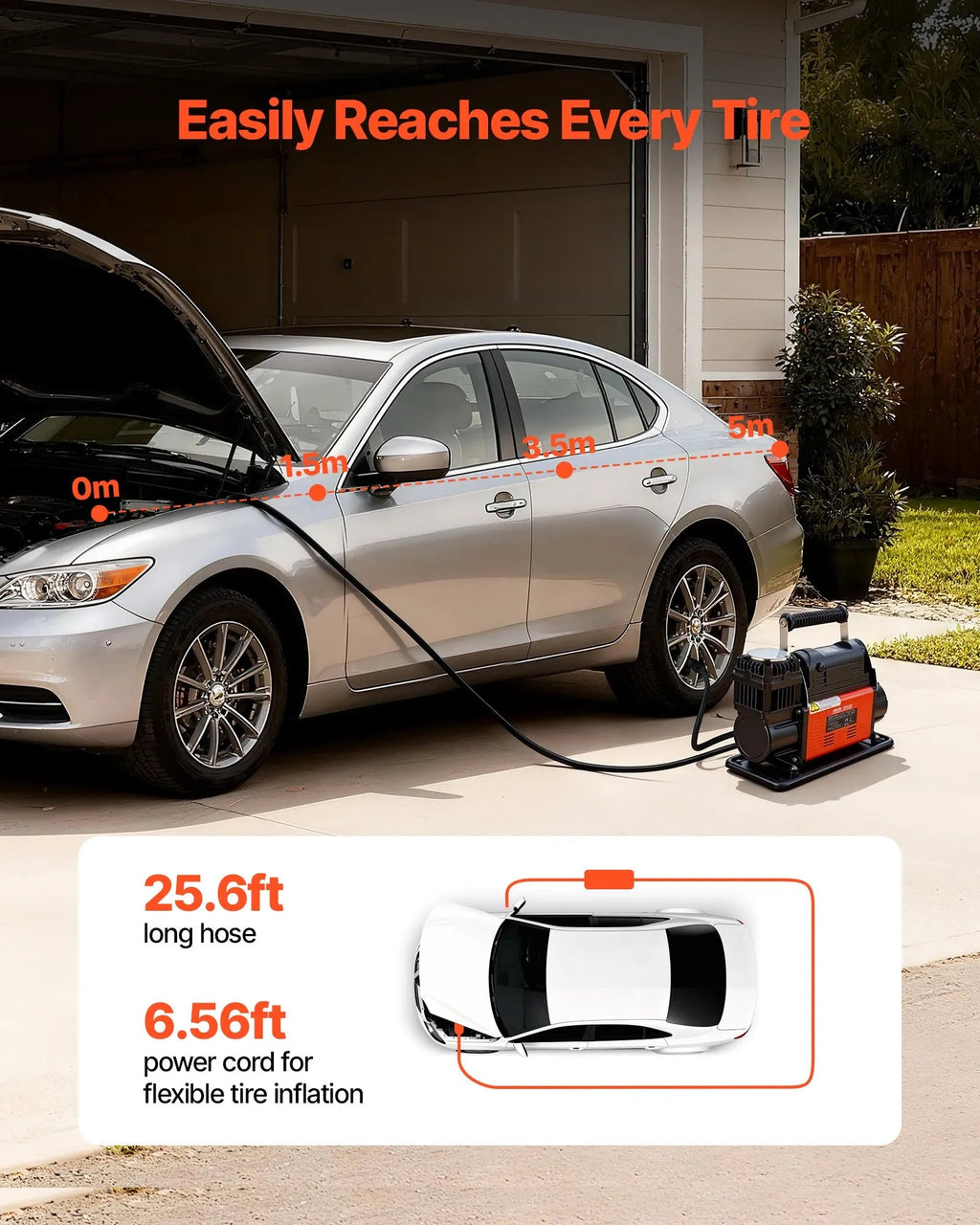Inflate tires quickly and accurately with the VEVOR 12V Heavy-Duty Air Compressor. Delivering 7.14 CFM airflow and up to 150 PSI, this portable inflator features an LCD digital display with preset pressure and auto-stop for safe, hands-free operation. Built for off-road and everyday use, it’s ideal for trucks, SUVs, RVs, and 4×4 vehicles.