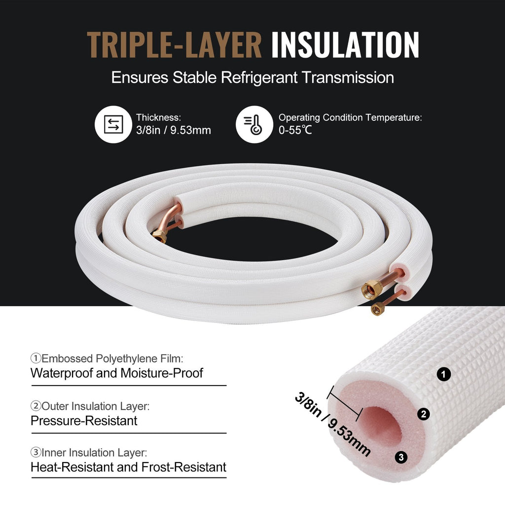 The VEVOR 16FT Mini Split Line Set is designed for air conditioning and heating pump equipment, ensuring optimal performance and efficiency. Featuring 1/4" & 1/2" O.D copper tubing, this line set comes with triple-layer insulation for exceptional thermal protection. It also includes a rich set of accessories for easy installation and long-lasting durability. Ideal for HVAC systems, this line set offers high flexibility and is built to withstand varying temperatures.