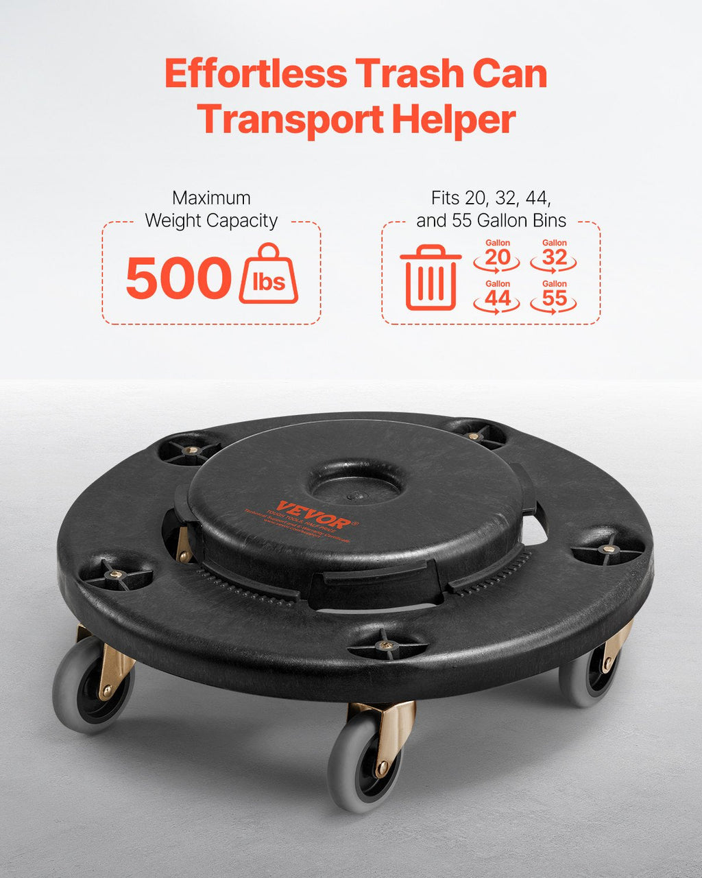 Make waste disposal easier with the VEVOR 2 Packs Round Trash Can Dolly, designed for seamless mobility and durability. Built to fit 20, 32, 44, and 55-gallon garbage containers, this heavy-duty bin cart provides effortless movement while being gentle on floors. The high-quality polypropylene construction ensures long-lasting use, making it ideal for both residential and commercial environments. With a 500 lbs weight capacity, it offers reliable support for even the heaviest bins.