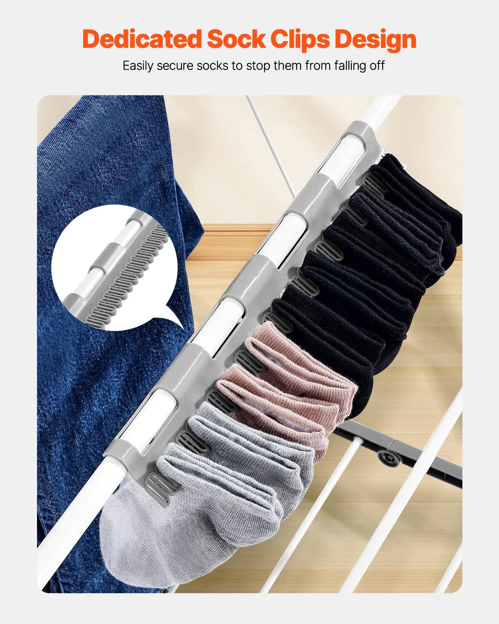 Includes sock clips for drying small garments securely