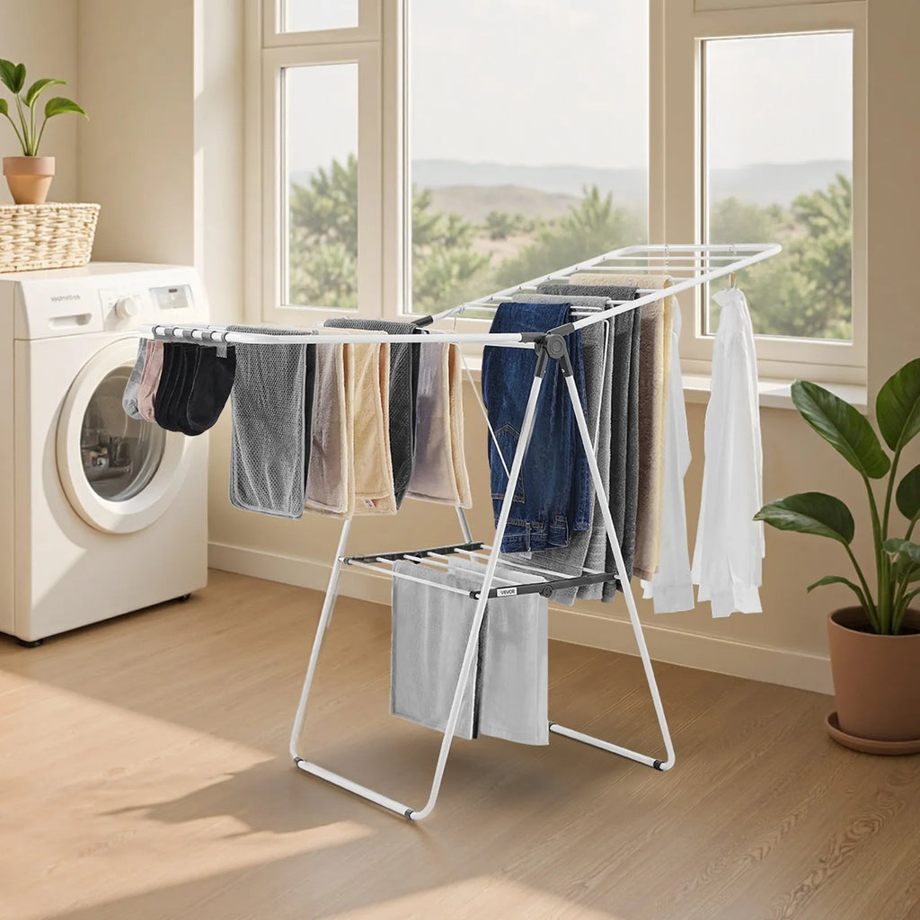 The VEVOR 2-Tier Foldable Clothes Drying Rack is a practical and space-saving solution for drying clothes indoors or outdoors. Designed with 21 drying rods and convenient sock clips, this rack offers plenty of space for hanging garments, towels, and small items. Its foldable design allows for easy storage when not in use, while the adjustable height provides flexibility for different clothing sizes. Built with durable iron tubes and PP plastic, this drying rack ensures stability, long-lasting performance, and efficient air circulation for faster drying.