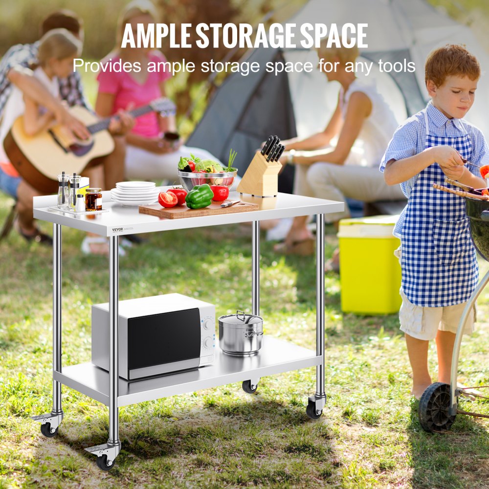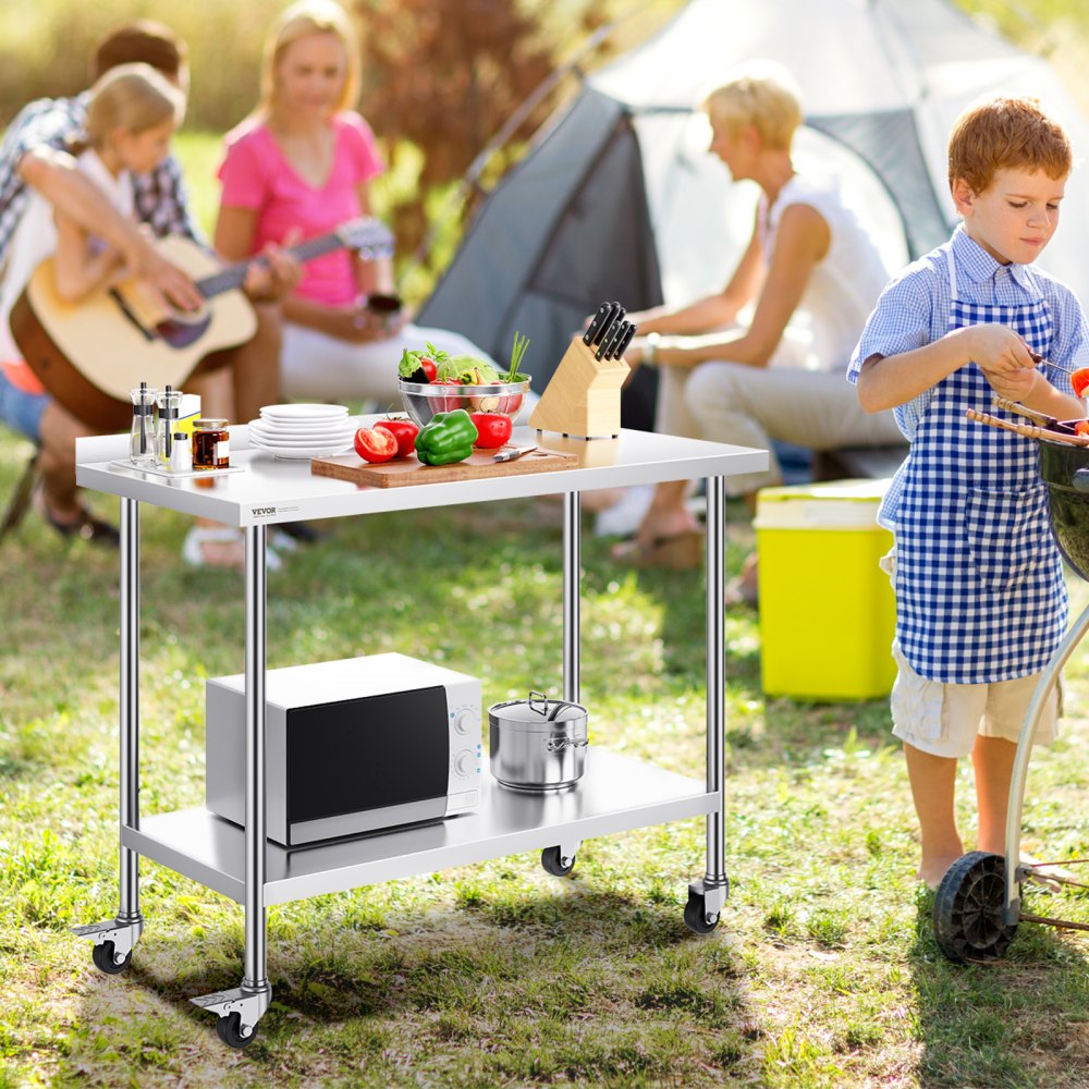Elevate your workspace with the VEVOR 24" x 48" Stainless Steel Work Table, designed for superior durability, mobility, and functionality. Perfect for restaurants, home kitchens, hotels, or workshops, this food prep table features a rust-resistant stainless steel surface, lockable casters for easy movement, and an adjustable height for ergonomic comfort. With a built-in 2" backsplash, it helps maintain cleanliness and keeps items in place.