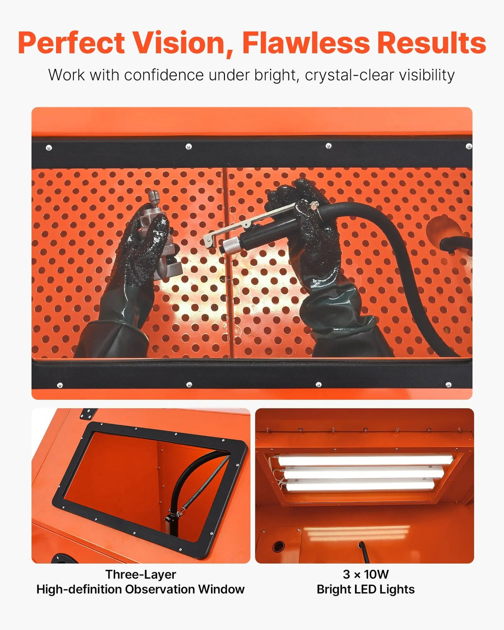 Clear HD Viewing Window & LED Lighting: A high-definition viewing window and 3×10W bright LED lights provide precise visibility, helping you maintain accuracy and consistency in every blasting task.