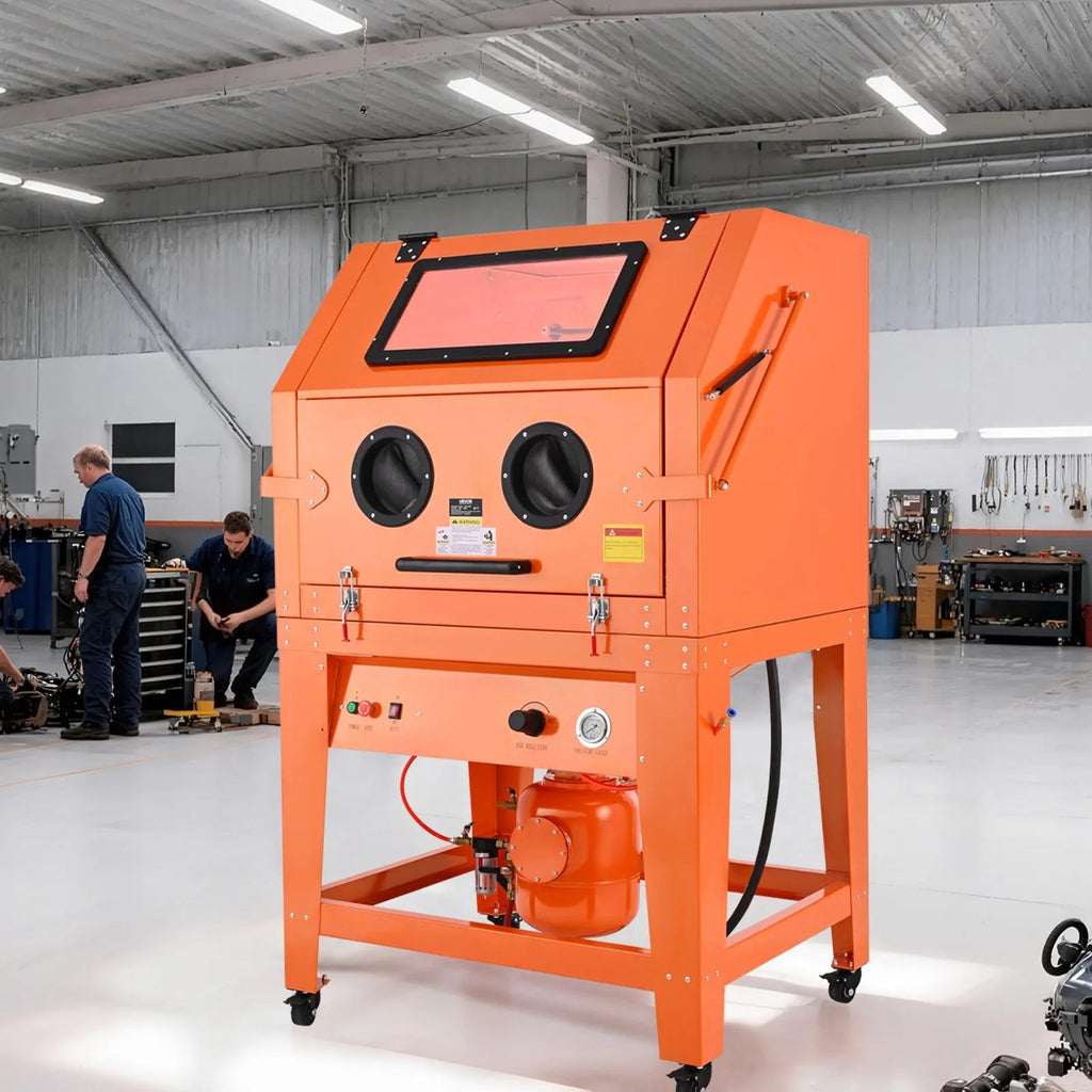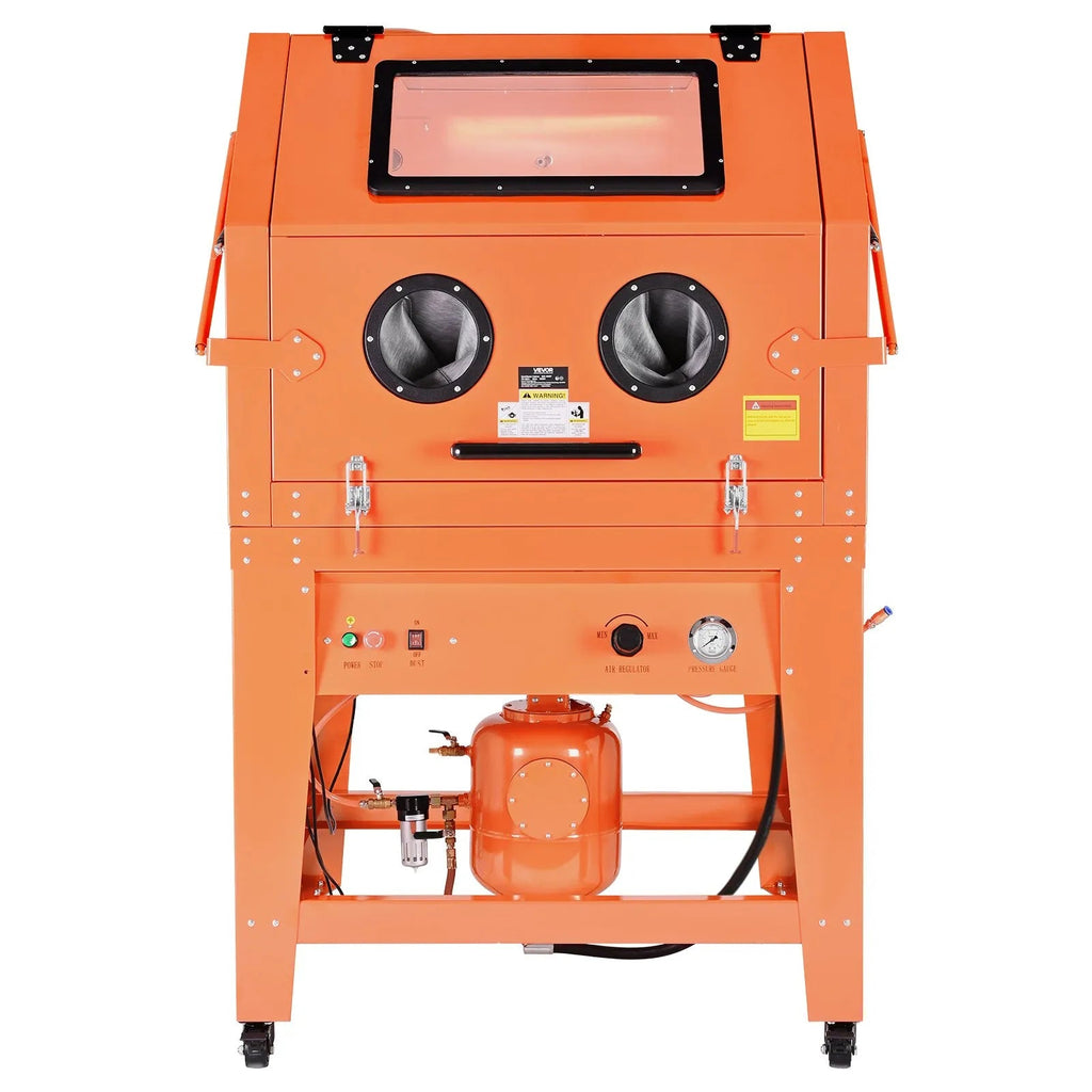 Let this industrial-grade sandblasting cabinet elevate your workshop efficiency! Designed for heavy-duty surface preparation, it combines a massive working area, a pressurized blasting system, and strong dust control to deliver fast, clean, and professional results. Built from durable cold-rolled steel and equipped with a 1.6HP dust collector, this 245-gallon cabinet is ideal for rust removal, paint stripping, restoration, and precision finishing of oversized parts.