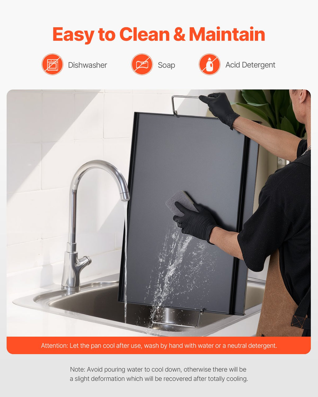 The VEVOR 24x16 in Flat Top Griddle is a premium, versatile cookware option designed to elevate your grilling and cooking experience, whether indoors or outdoors. With a generous cooking surface of 24" x 14" (605 x 360 mm), this griddle provides ample space for preparing multiple meals simultaneously, making it perfect for family cookouts, camping trips, tailgating, or home kitchens. Made from high-quality carbon steel, it offers exceptional heat retention and even heat distribution, ensuring perfectly cooked meals every time. Built to withstand temperatures up to 500°F (260°C) without warping, it’s ideal for searing, sautéing, and grilling. The durable black-coated surface is easy to clean, and its universal flat top design allows compatibility with a wide range of stovetops and grills. Weighing just 14.6 lbs (6.61 kg ±5%), this griddle is easy to transport and makes a perfect gift for grilling enthusiasts and food lovers alike.