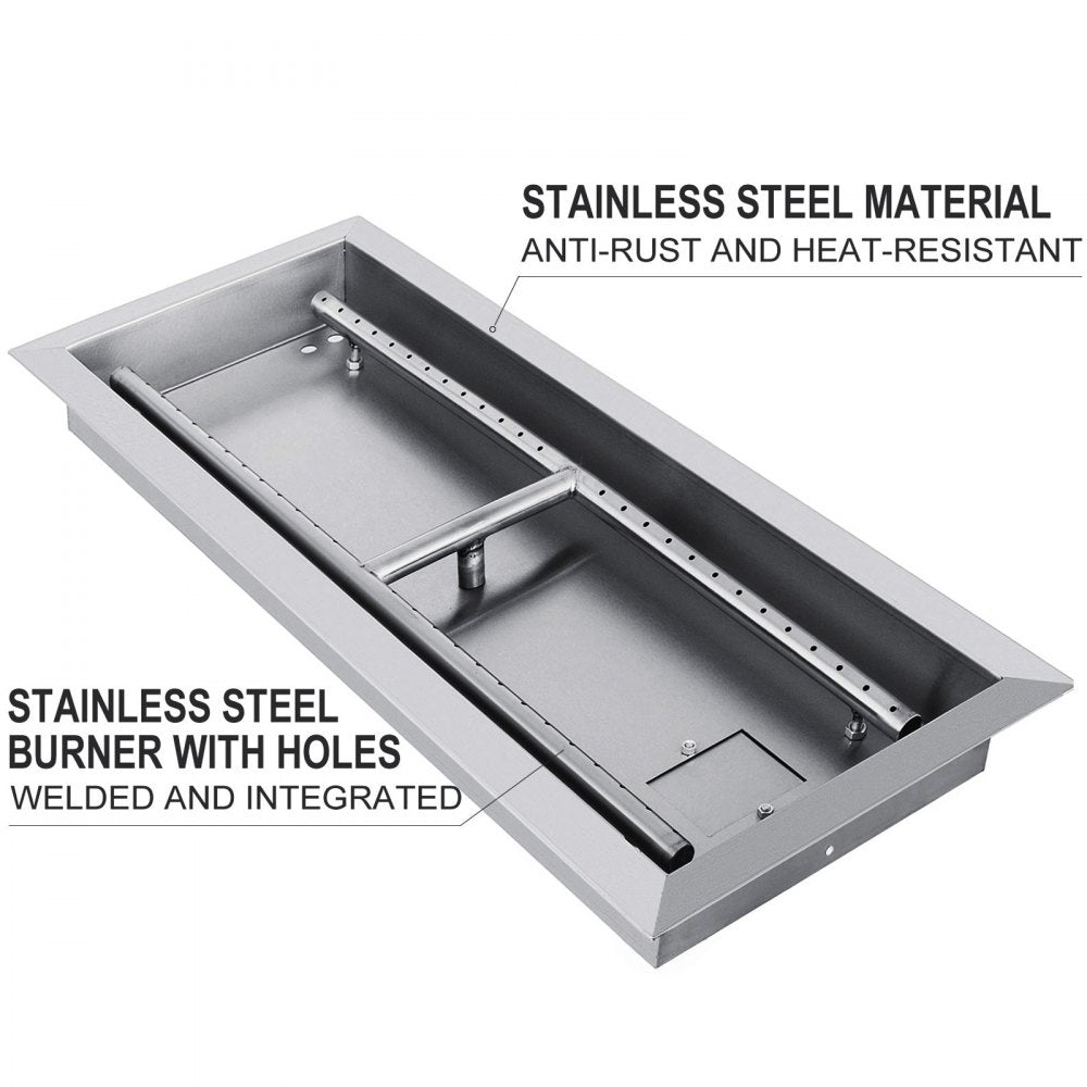 Create a cozy and captivating fire feature with the VEVOR 25.5 x 10 Inch Fire Pit Pan. Crafted from durable 201 series stainless steel, this rectangular fire pit insert is built to resist rust and wear, delivering long-lasting performance in both indoor and outdoor environments. With a built-in burner capable of producing up to 90,000 BTU, it offers a powerful and consistent flame that’s perfect for gatherings, relaxation, or entertaining. Compatible with both propane and natural gas, this fire pit pan provides versatility and ease of installation for a wide range of applications.