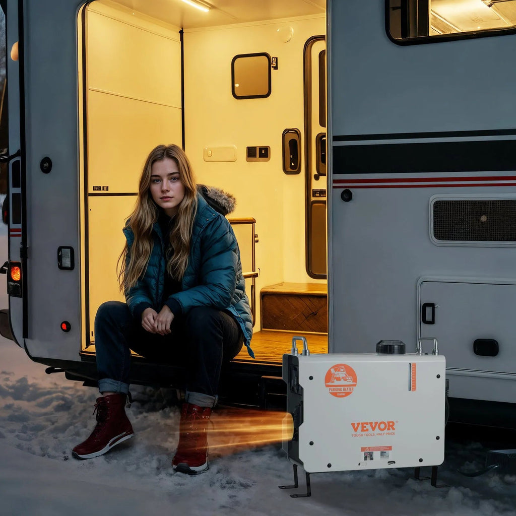 The VEVOR 2KW Diesel Heater is an all-in-one portable air heater designed for vehicles, RVs, trucks, cabins, and outdoor use. Equipped with dual wiring options (adapter and DC12V), it provides plug-and-play flexibility for use with standard outlets, vehicle batteries, or outdoor power stations. With a 2kW output and ≥90% combustion efficiency, it heats spaces quickly while consuming only 0.18–0.35 L/h diesel. The heater operates quietly at ≤75dB and includes a built-in CO alarm, leak-proof fuel cap, fuel gauge, and overheat protection for safe use. Control your heater via Bluetooth app, remote, or display panel for a convenient and comfortable heating experience.