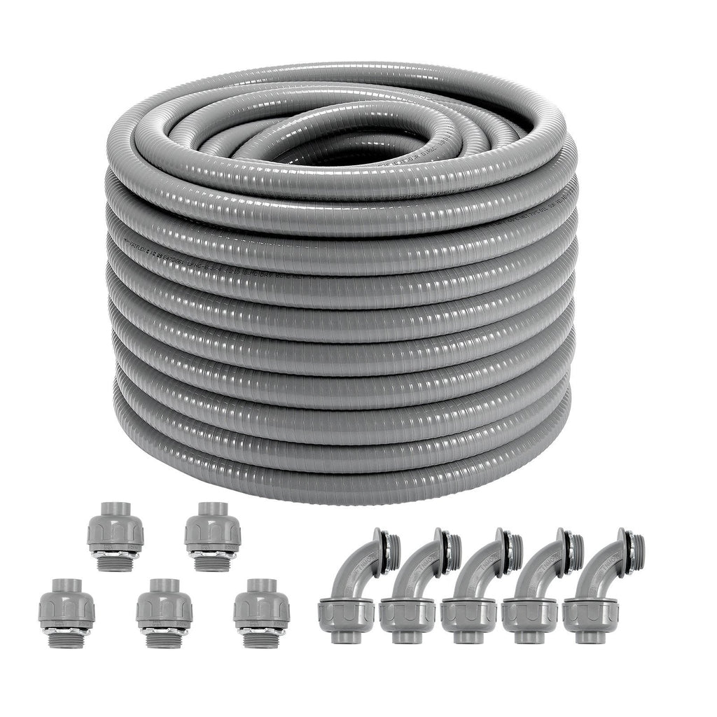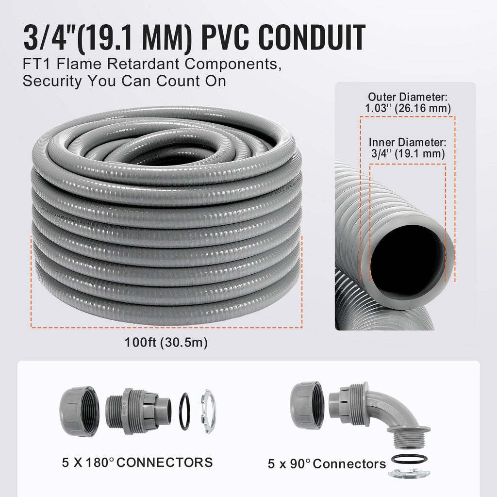 Protect your electrical wiring with the VEVOR 3/4-Inch Flexible Electrical Conduit. Designed for superior durability and performance, this liquid-tight conduit provides comprehensive protection for air conditioning units, motor controllers, pumps, and other electrical systems. With a 100 ft length and included straight and 90-degree connectors, this conduit is ideal for a wide range of applications. Its IP65 rating ensures excellent waterproof and dustproof protection, while the flame-retardant materials ensure long-lasting safety.
