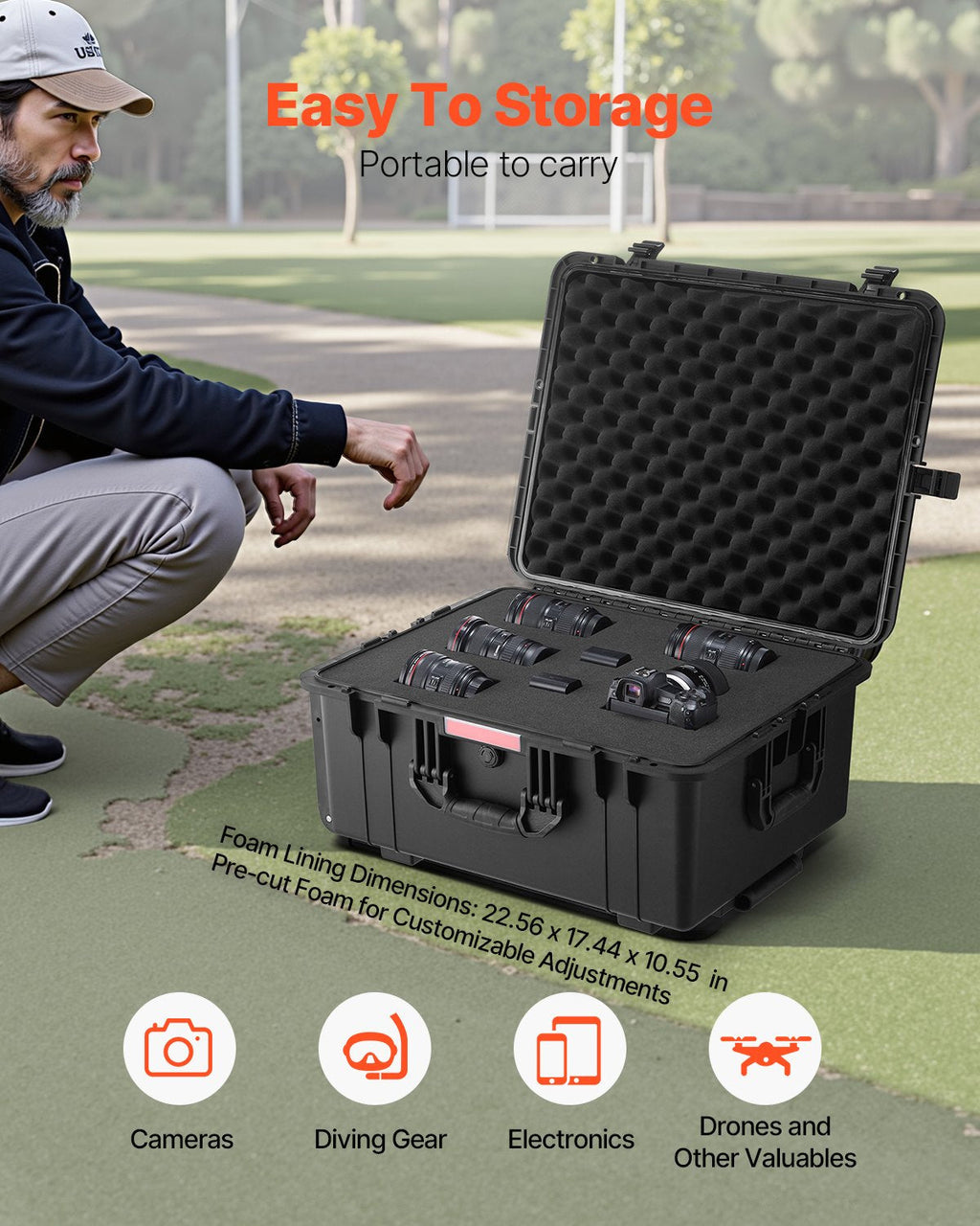 The VEVOR 3.5 Cu.ft Weatherproof Hard Case is designed to protect your valuable equipment in the harshest conditions. Made from durable polypropylene (PP), this case is equipped with an IP67 waterproof rating, ensuring that your contents stay dry even in extreme weather. The customizable interior foam liner allows for personalized organization, while the anti-theft security features, including four locking holes and multiple clips, provide peace of mind. For easy transport, this case includes durable rolling wheels and a retractable telescoping handle. Whether you're traveling, storing, or shipping equipment, this hard case offers all-around protection with a professional, weatherproof design.