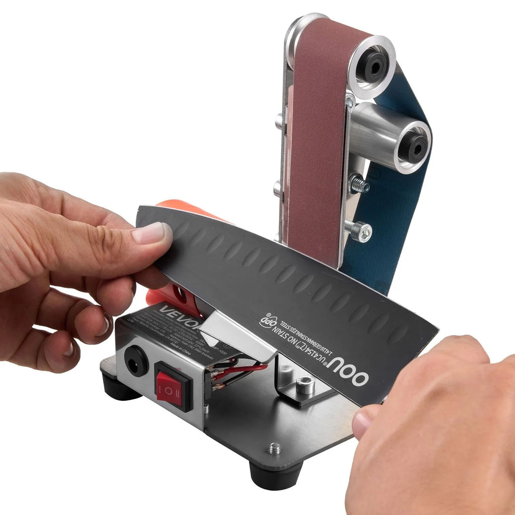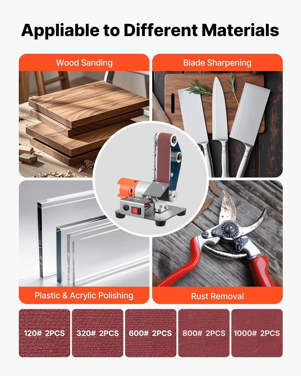 The VEVOR 3-in-1 Mini Belt Sander combines a sanding belt, grinding wheel, and polishing wheel into one compact, versatile tool. Perfect for woodworking, jewelry making, knife sharpening, and DIY crafting, it offers adjustable speed, forward/reverse control, and a variety of sanding belts for precise, professional results.