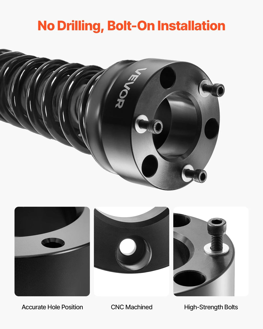 3-Inch Front Lift: Includes two bottom strut spacers and high-strength bolts to raise the front chassis. Note: Spacer thickness may vary from actual lift height due to suspension geometry.