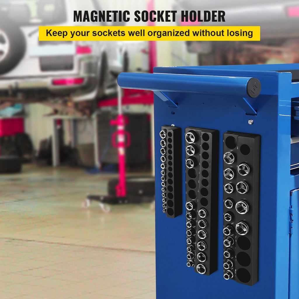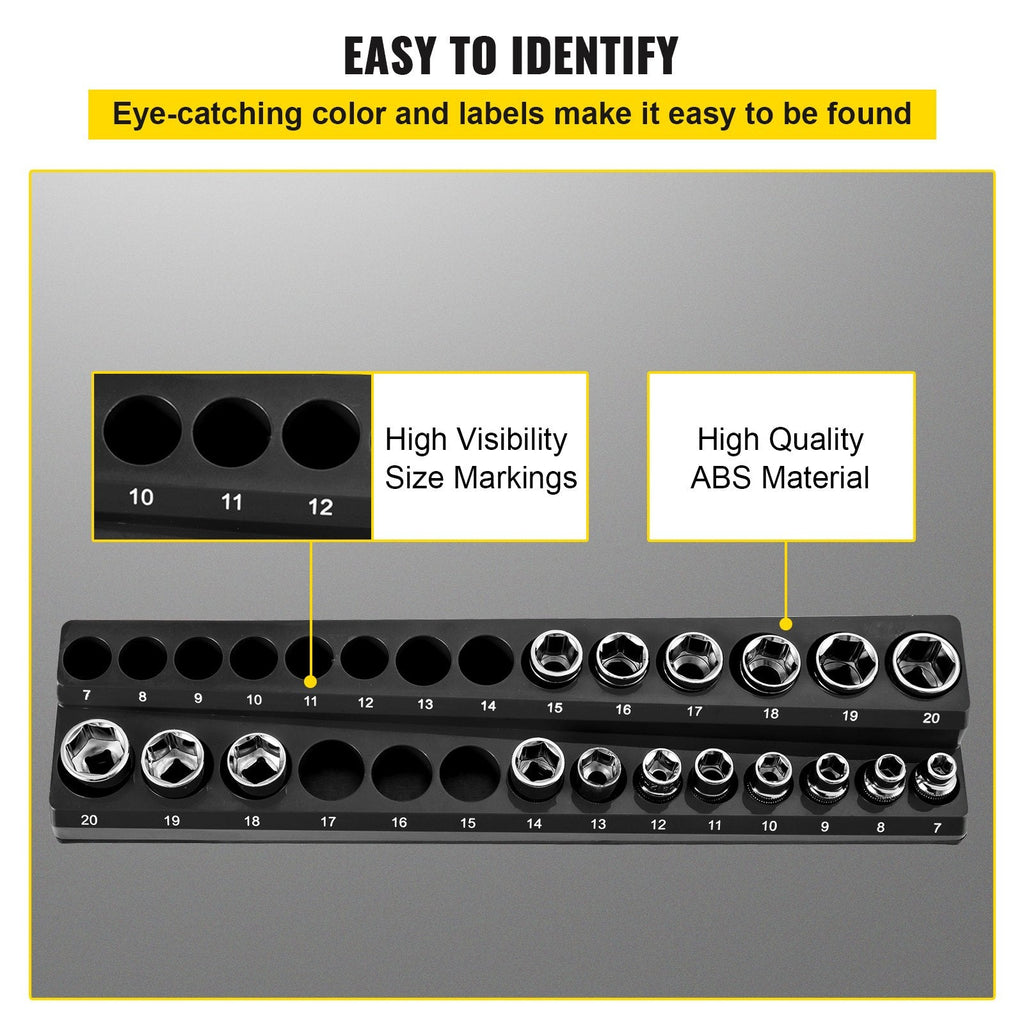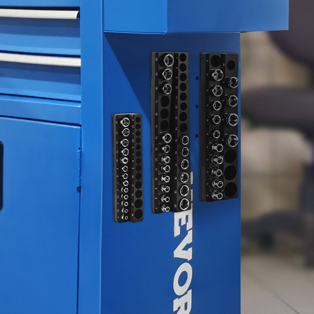 Keep your toolbox neat, organized, and efficient with the VEVOR 3-Pack Metric Magnetic Socket Organizer Set. Designed to hold up to 75 metric sockets across 1/4", 3/8", and 1/2" drive sizes, this heavy-duty ABS plastic organizer securely mounts to metal surfaces without scratching, thanks to its strong yet non-damaging magnetic base. With clearly labeled high-visibility metric markings from 4 mm to 27 mm, finding the right socket has never been faster. Whether you're a DIYer or a professional mechanic, this durable black socket tray set delivers performance, convenience, and space-saving organization.