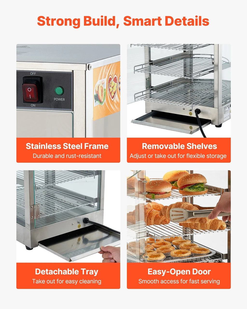 Keep your food warm and attractively displayed with the VEVOR 3-Tier Commercial Food Warmer Display, an 800W countertop warmer with LED lighting, adjustable shelves, and a stainless steel frame. Ideal for bakeries, cafés, fast-food shops, and convenience stores, this display ensures your food stays at the perfect serving temperature while looking appealing to customers.