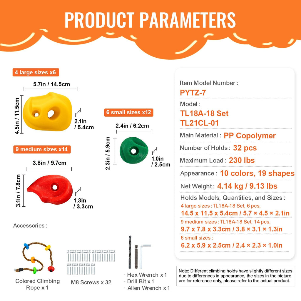 The VEVOR 32 Rock Climbing Holds Set provides everything you need to create your own indoor or outdoor climbing wall. With a variety of sizes and shapes, these durable holds offer an exciting challenge for climbers of all levels. Constructed from high-quality PP copolymer, they ensure long-lasting performance and safety. The included colored climbing ropes and hardware make installation quick and easy, so you can set up your climbing wall in no time. Designed for both indoor and outdoor use, these rock climbing holds are perfect for gyms, homes, schools, and outdoor adventures.