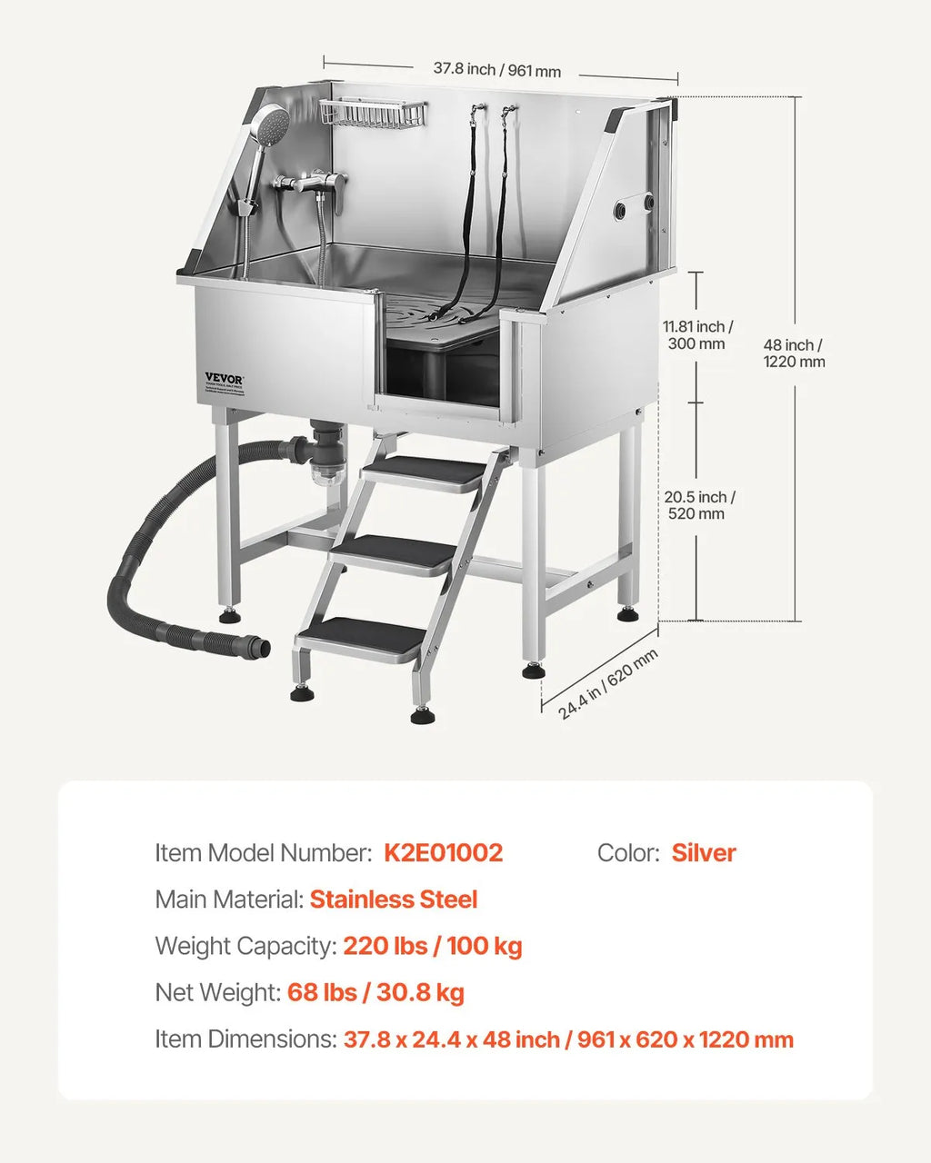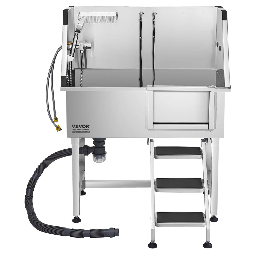 The VEVOR 38" Dog Grooming Bath Tub is a professional stainless steel grooming solution designed for pets. Equipped with telescoping stairs, a multifunctional shower area, and an integrated faucet and showerhead, it ensures safe, convenient, and efficient grooming. Its upgraded water filter board and reliable edges provide a clean and secure experience for your pets.