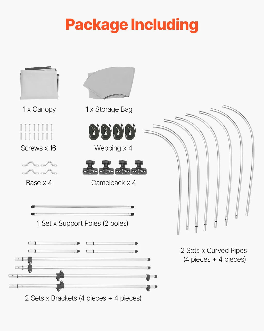 The VEVOR 4 Bow Boat Bimini Top provides reliable sun and weather protection for boats, combining durable construction with convenient folding options. Designed to fit boats with widths of 91"–96" and a height of 54", this awning canopy is crafted from waterproof and UV-resistant materials to shield passengers from sun and rain. Rust-resistant components ensure long-lasting performance, while its lightweight design and easy storage make it ideal for boating adventures. Perfect for enhancing comfort and protection on the water.