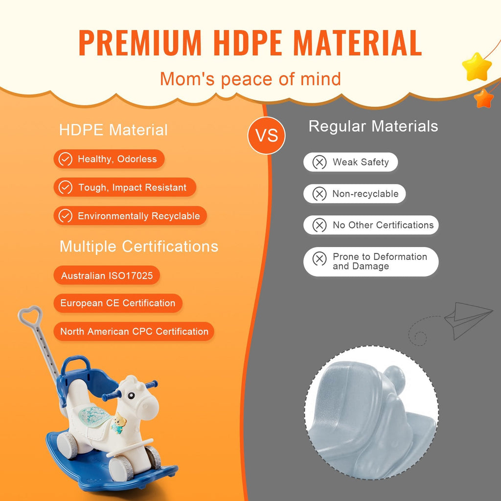The VEVOR 4-in-1 Rocking Horse for Toddlers is a versatile and fun ride-on toy designed to grow with your child. Perfect for kids aged 1–3 years, this multifunctional toy transitions easily between a rocking horse, balance board, push ride-on, and wheeled walker. Built from safe, non-toxic HDPE, it supports up to 80 lbs, ensuring long-lasting use. With built-in sound effects, a smooth and sturdy design, and safety features like a supportive backrest and anti-slip base, this rocking horse offers both entertainment and peace of mind for parents.