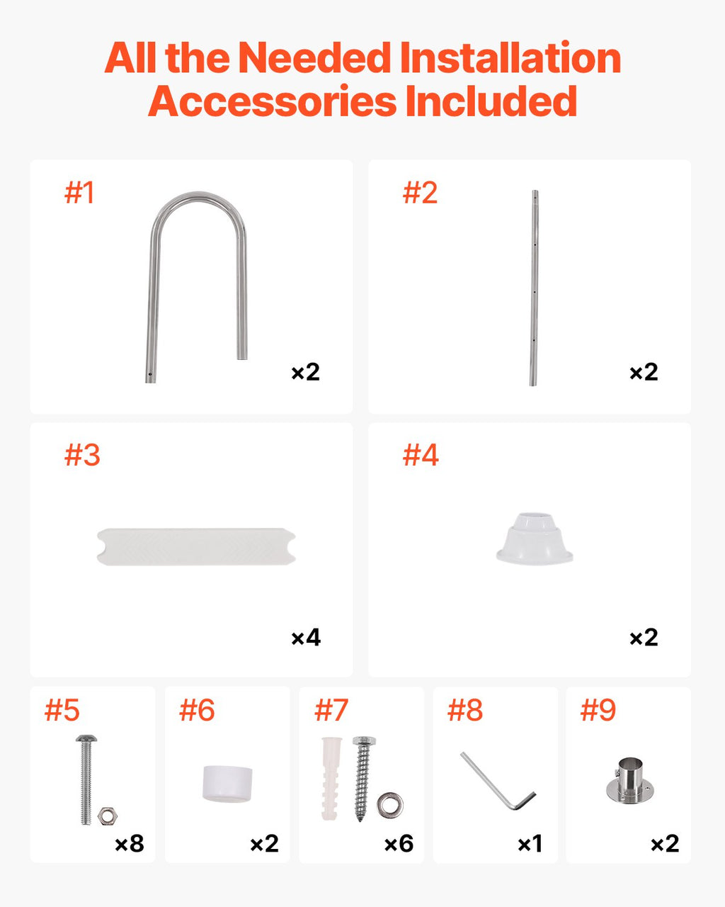 Step into your pool safely and comfortably with the VEVOR 4-Step Stainless Steel Pool Ladder. Designed for 54-inch decked pools, this ladder features two ergonomic handrails and four wide, anti-slip steps, offering excellent grip and stability. Constructed from rust-resistant 304 stainless steel and durable PP, it’s built to handle both indoor and outdoor use. Whether for home or commercial pools, this ladder ensures easy access with a sleek, user-friendly design.