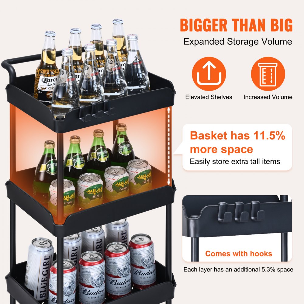 The VEVOR 4-Tier Rolling Utility Cart is a practical and stylish storage solution designed for kitchens, offices, living rooms, and more. With four spacious basket-style shelves made from durable PP material, this cart offers plenty of room to organize your essentials. Featuring lockable wheels and a sturdy handle, it’s easy to move and keep secure wherever you need it. Its sleek black finish complements any space, combining function and modern style in one versatile trolley.