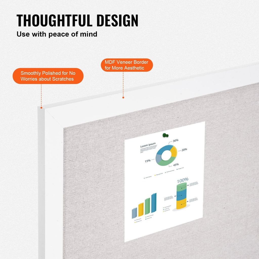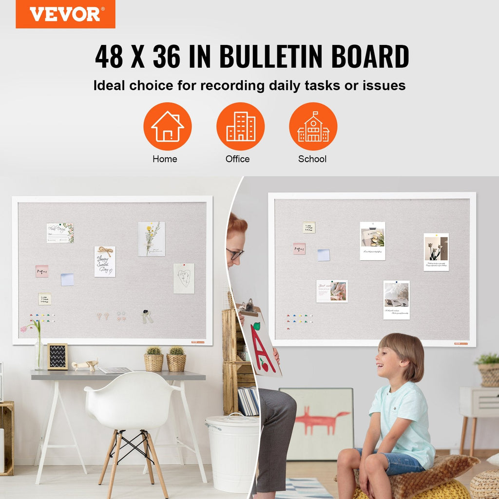 The VEVOR 48"x36" White Cork Board with Linen Surface is a stylish and functional addition to any home, office, or classroom. Featuring a premium linen surface, this bulletin board offers a durable and smooth texture ideal for pinning notes, photos, and reminders. Its large size provides ample space for organizing and displaying important information, while the sleek MDF veneer border ensures long-lasting use. Perfect for both horizontal and vertical wall mounting, this versatile board is an essential tool for anyone looking to stay organized.