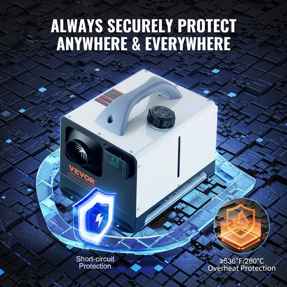 The VEVOR 5-8KW Diesel Heater is an all-in-one portable air heater designed for trucks, vans, RVs, trailers, and campers. Equipped with dual wiring options (110V adapter and DC12V T-shaped plug), it provides flexible plug-and-play operation for vehicles, outdoor batteries, or US standard sockets. With fuel-efficient performance consuming only 0.16–0.62 L/h and ≥90% heating efficiency, it keeps a 215ft²/20m² area warm while operating quietly at ≤75dB. The heater offers dual control via a 98ft/30m remote and LCD display, adjustable temperatures from 46.4–96.8℉ / 8–36℃, and a wide working range of -40℉ to 104℉ / -40℃ to 40℃. Multiple built-in protections—including overheat, short circuit, overcurrent, overvoltage, and reverse connection—ensure safe and reliable operation. Professional installation and external exhaust venting are recommended.