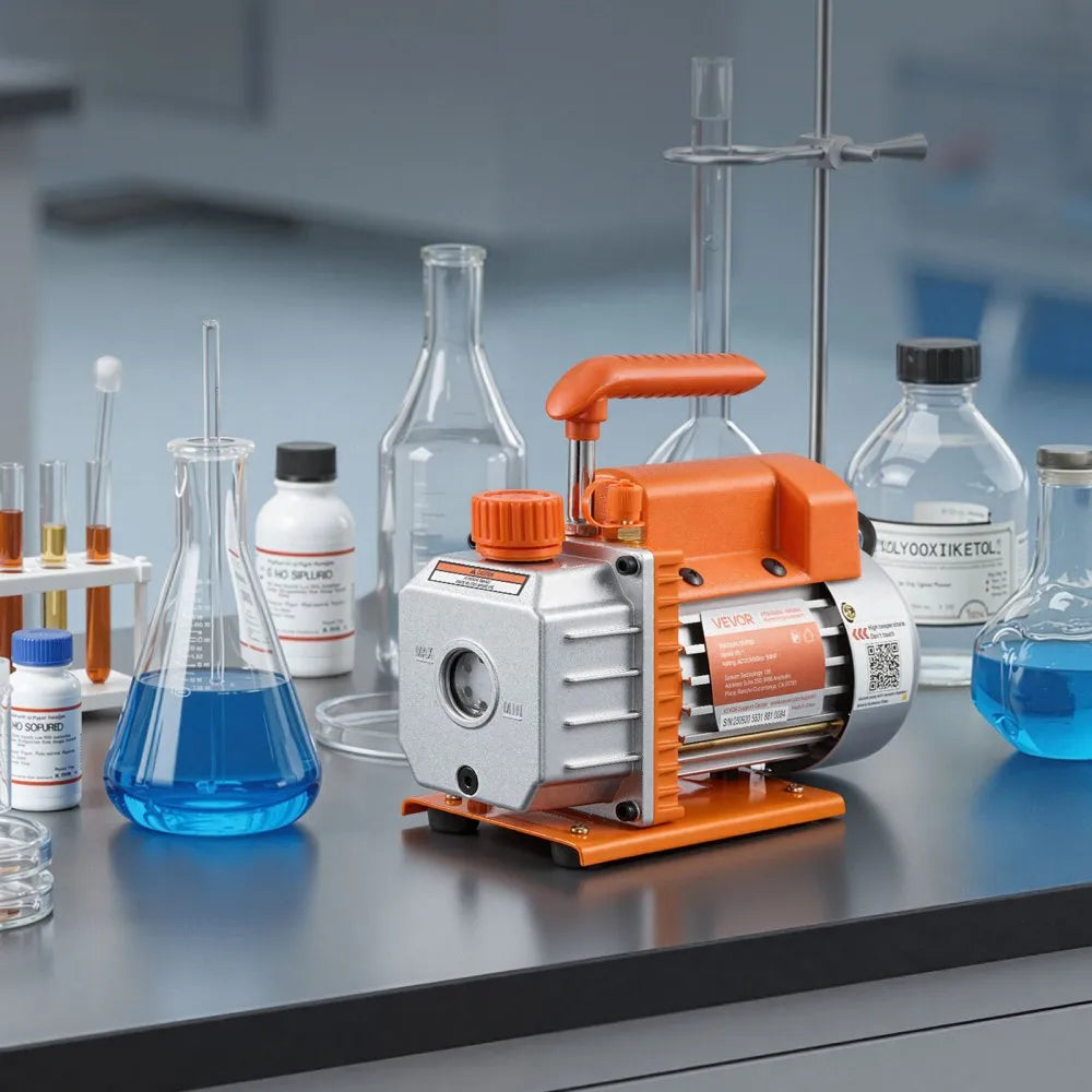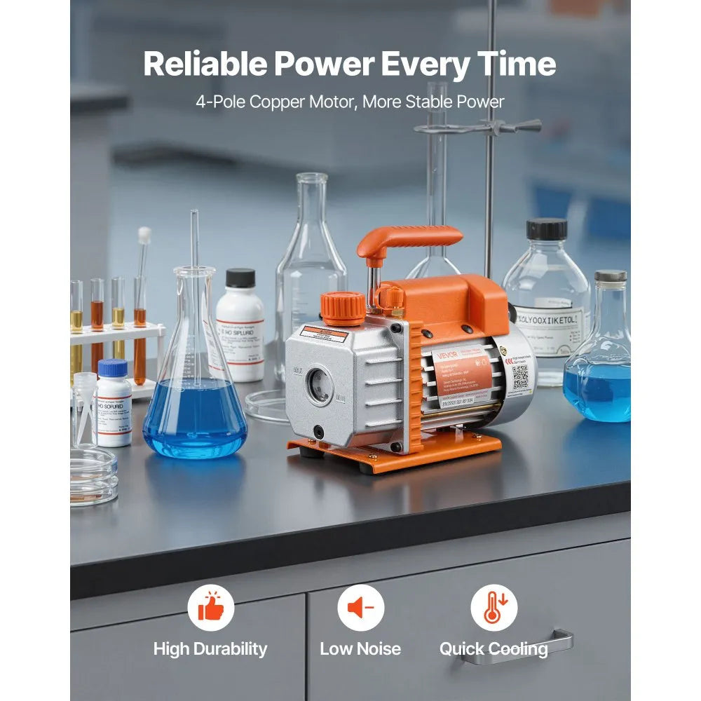 3.5 CFM single-stage vacuum pump reaches an ultimate vacuum of 5 Pa, ideal for laboratory work, resin casting, silicone degassing, food packaging, and wood stabilization. -
