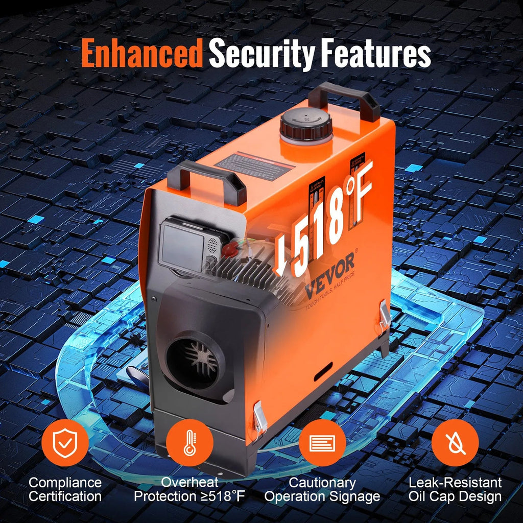 Equipped with Bluetooth app control, LCD panel, and remote control, the VEVOR diesel heater allows convenient operation from up to 98 ft/30 m. Automatic altitude compensation ensures consistent performance up to 18,045 ft/5,500 m, while low energy consumption and a 5L fuel tank provide up to 10 hours of continuous heat. With precise temperature control, preheating, voice prompts, and overheat protection, this diesel heater offers a safe and comfortable heating experience.