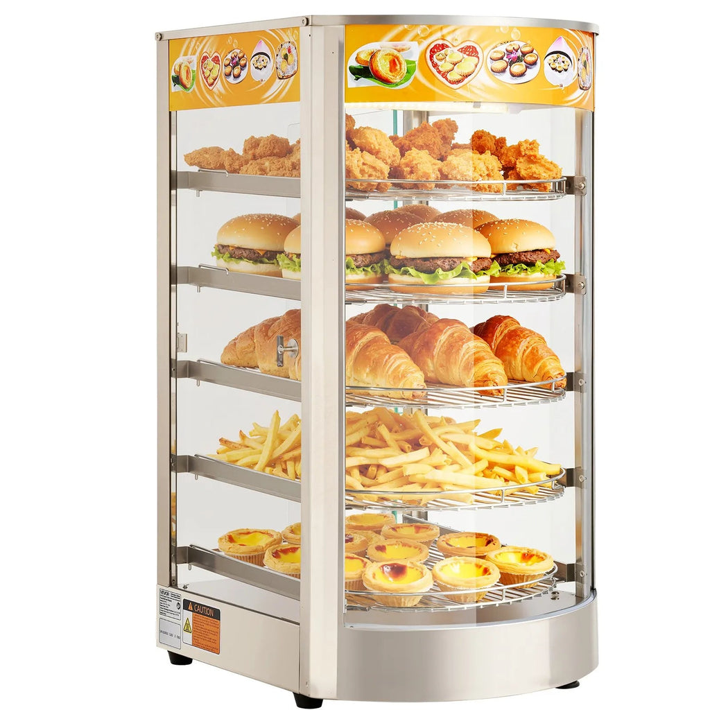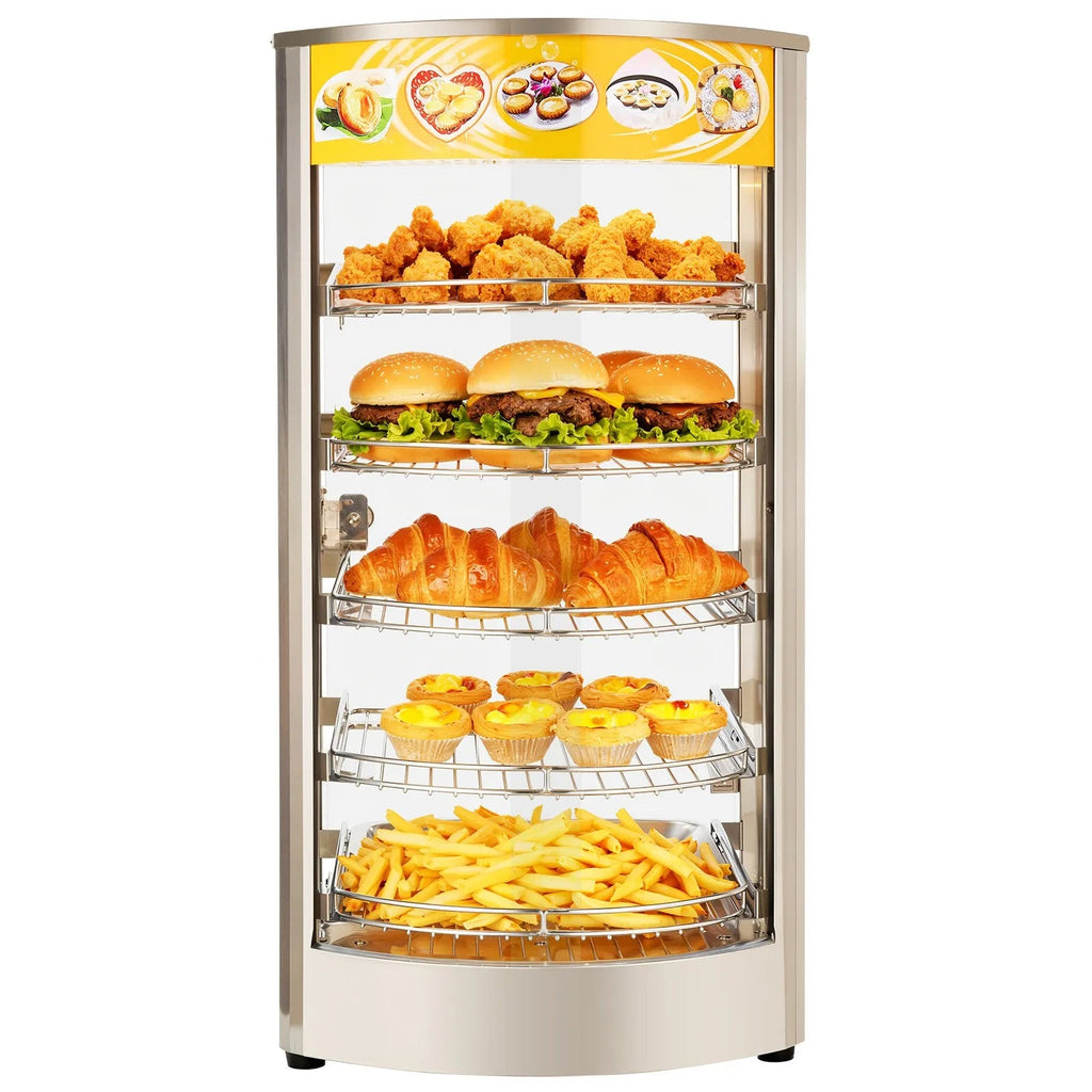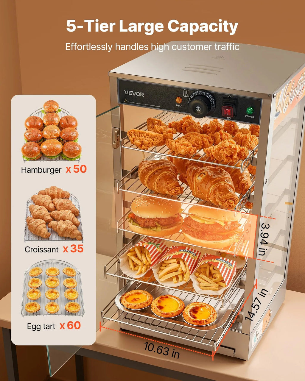 Showcase and keep your food warm with the VEVOR 5-Tier Commercial Food Warmer Display, an 800W countertop warmer with LED lighting, adjustable shelves, and a stainless steel frame. Perfect for bakeries, cafés, fast-food shops, and convenience stores, this display ensures your food stays at the ideal serving temperature while attracting customers.