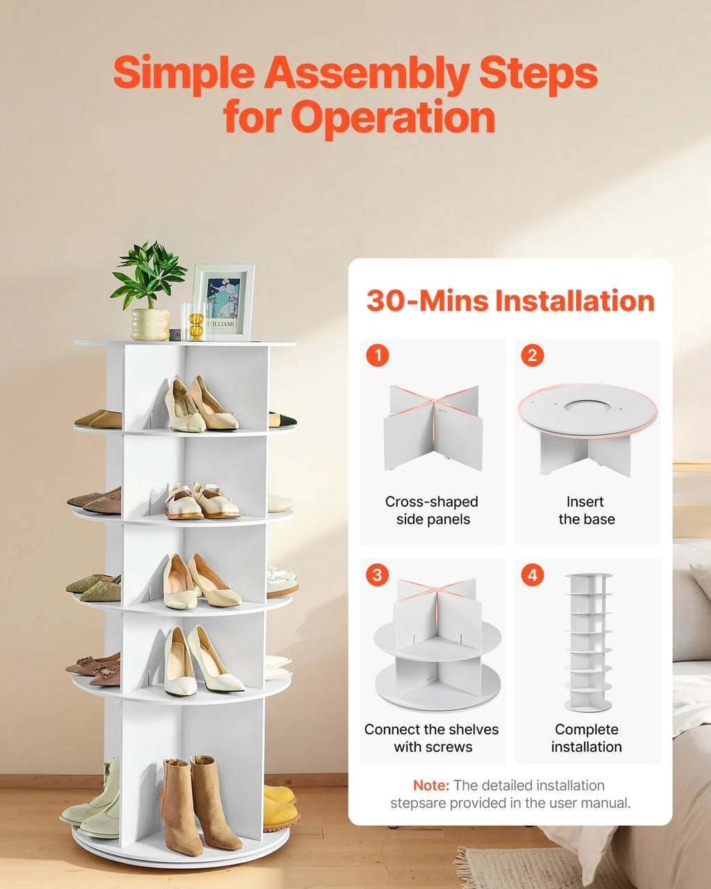 Organize your footwear efficiently with the VEVOR 5-Tier Rotating Shoe Rack Tower. Its 360° rotating design makes shoes easily accessible while saving space in any room.