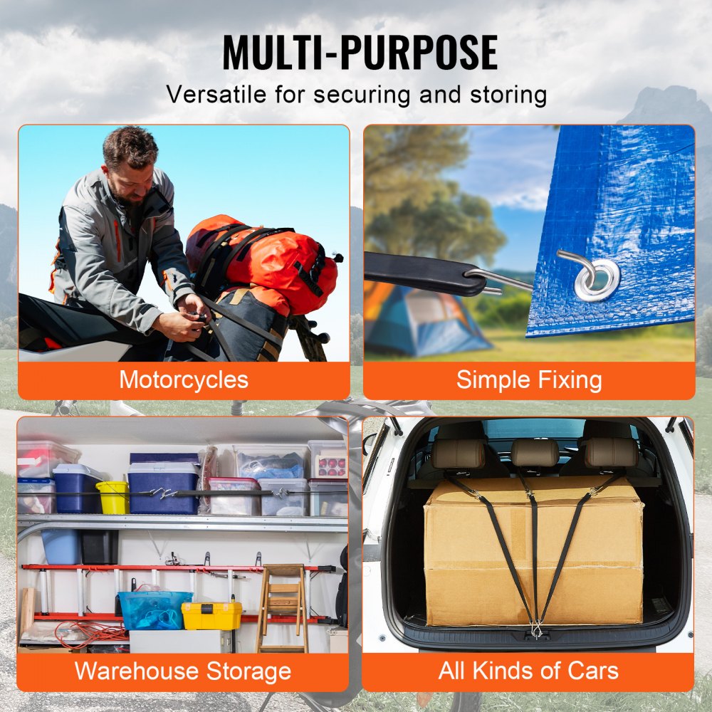 Secure your cargo with confidence using the VEVOR 50 Pcs Flat Bungee Cord Set. Designed for maximum durability and stretch, these 32-inch flat rubber bungee cords feature high-strength steel S-hooks and a wide, tangle-free design ideal for securing loads, camping gear, moving equipment, and more. Built to handle up to 300 N of tension, this heavy-duty set is a reliable choice for everyday and professional use.