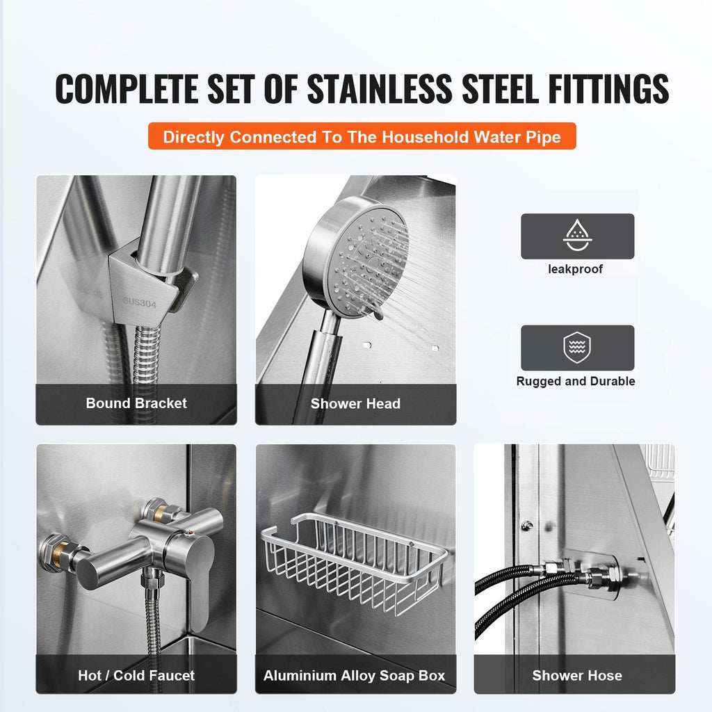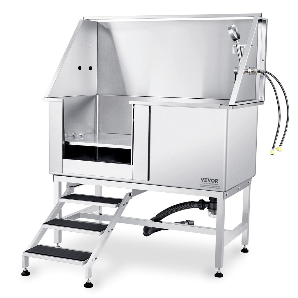 Take pet grooming to the next level with the VEVOR 50" Pet Bathing Station. Designed for home and professional use, this heavy-duty stainless steel tub supports up to 330 lbs and features a left-side door, foldable stairs, and a soap box. The ergonomic layout eliminates back strain, while versatile accessories make it perfect for pets of all sizes.