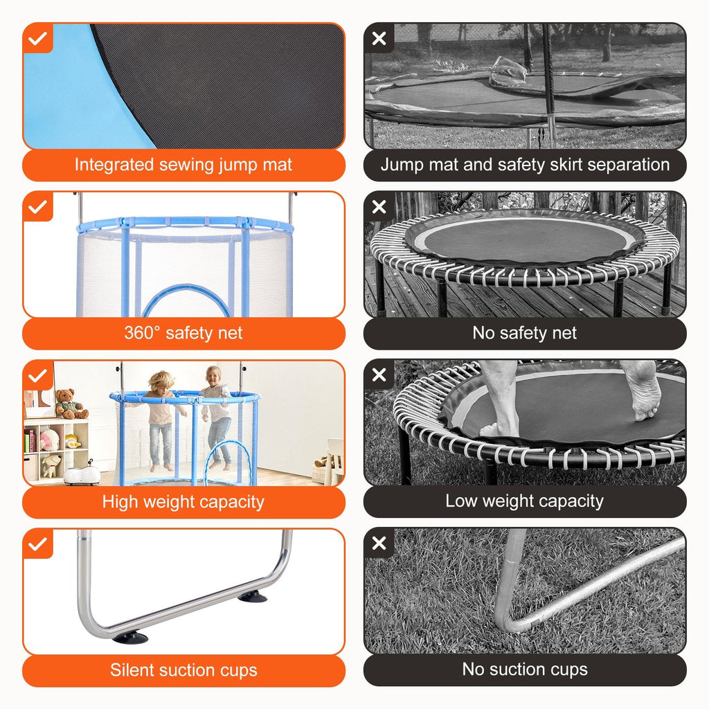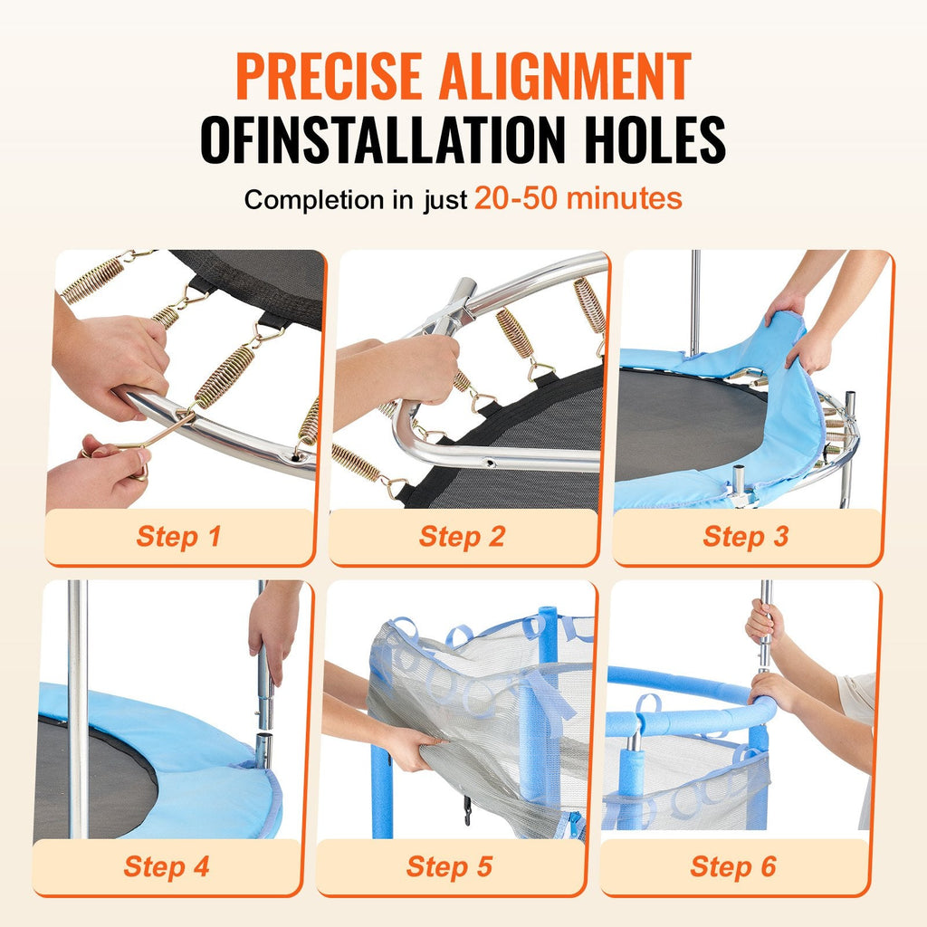 The VEVOR 55" Trampoline for Kids is the perfect way to bring fun and exercise to your little ones. Designed with safety and entertainment in mind, this mini toddler trampoline features 3 height-adjustable handles to grow with your child. Whether indoors or outdoors, it's perfect for burning energy and promoting healthy movement. The sturdy construction and safety net ensure your child can jump with confidence, while the easy assembly makes setup a breeze.