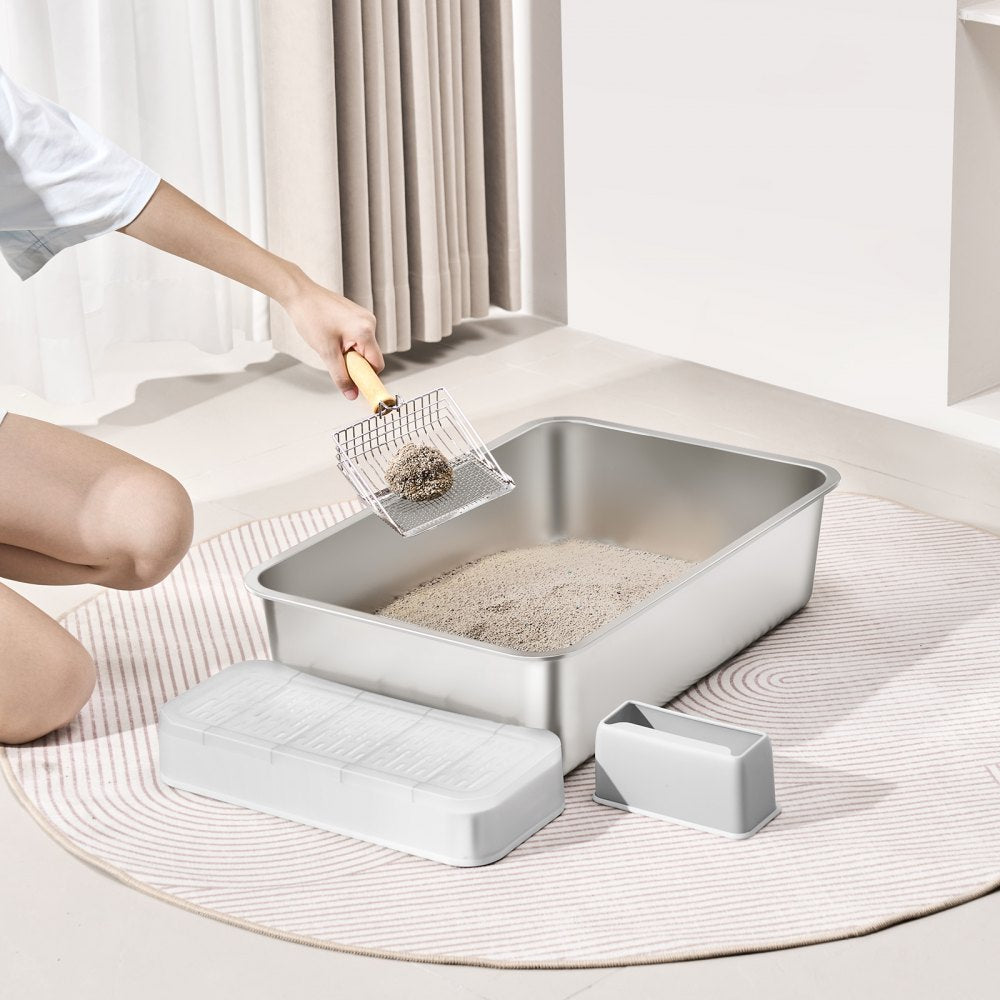 The VEVOR 6-inch Deep Cat Litter Box is designed to offer a cleaner, more comfortable litter experience for both cats and their owners. With a spacious design suitable for XL cats, this odor-free litter box features a wide filtering footboard to reduce litter tracking and maintain cleanliness around your home. The 6-inch deep pan ensures high capacity for waste and litter, while the smooth surface allows for easy cleaning. Its sleek silver finish blends well with any interior.