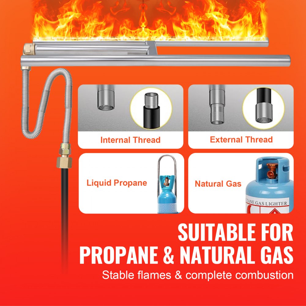 Transform your fire feature into a stunning focal point with the VEVOR 6 x 18 inch Drop-In Fire Pit Pan. Engineered from durable SUS304 stainless steel, this rectangular fire pit burner delivers a powerful 90,000 BTU output, compatible with both natural gas and propane. Featuring a reliable H-style burner design and precision-drilled ports for even flame distribution, it’s ideal for both indoor fireplaces and outdoor fire pits. Whether you're upgrading your backyard or creating a cozy indoor ambiance, this pan blends safety, function, and style.
