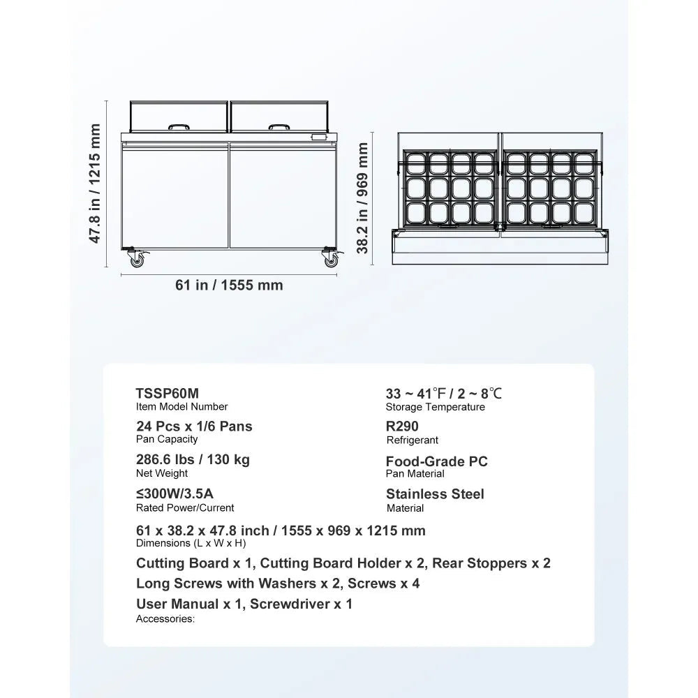Keep your ingredients fresh and ready with the VEVOR 60"W Commercial Sandwich Prep Refrigerated Table. Designed for restaurants, food trucks, and cafes, this mega-top prep fridge features 24 stainless steel 1/6 pans and a large cutting board, making sandwich and salad preparation fast, efficient, and hygienic. Built with durable stainless steel and food-grade components, it ensures reliable cooling, easy cleaning, and smooth mobility with brake casters.