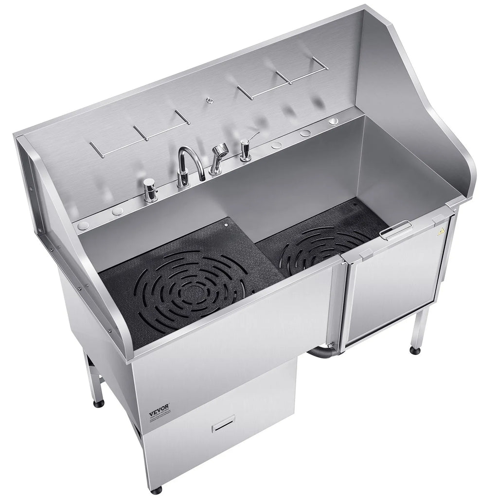 The VEVOR 61" Dog Grooming Bath Tub is a professional-grade grooming solution designed for pet owners and groomers. Constructed from durable 304 stainless steel, it offers long-lasting rust resistance and easy cleaning. The tub features an integrated shower area, upgraded water filter board, and reliable edges for safe and efficient grooming. Adjustable legs ensure stable positioning on uneven surfaces, while the included ramp makes it easy for pets to enter and exit. Ideal for grooming dogs of various sizes, this tub combines functionality, durability, and convenience.