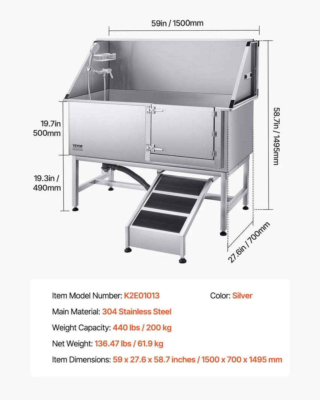 Make grooming safe and convenient with the VEVOR 62 Inch Dog Grooming Bath Tub. Crafted from durable 304 stainless steel, this bath tub features a multifunctional shower area and an upgraded water filter board for easy cleaning and water management. Adjustable legs provide stability on any surface, while the integrated shower area and reliable edges ensure comfort and safety for your pets. Perfect for grooming at home or in professional settings, this tub handles dogs of various sizes with ease.